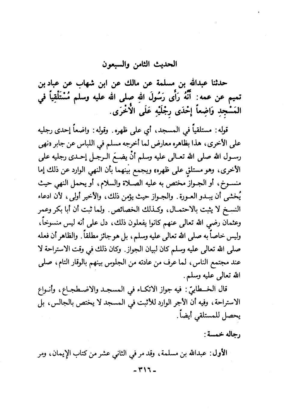 حَدَّثَنَا عَبْدُ اللَّهِ بْنُ مَسْلَمَةَ عَنْ مَالِكٍ عَنِ ابْنِ شِهَابٍ عَنْ عَبَّادِ بْنِ تَمِيمٍ عَنْ عَمِّهِ: أَنَّهُ رَأَى رَسُولَ اللَّهِ -صلى الله عليه وسلم- مُسْتَلْقِيًا فِي الْمَسْجِدِ، وَاضِعًا إِحْدَى رِجْلَيْهِ عَلَى الأُخْرَى.