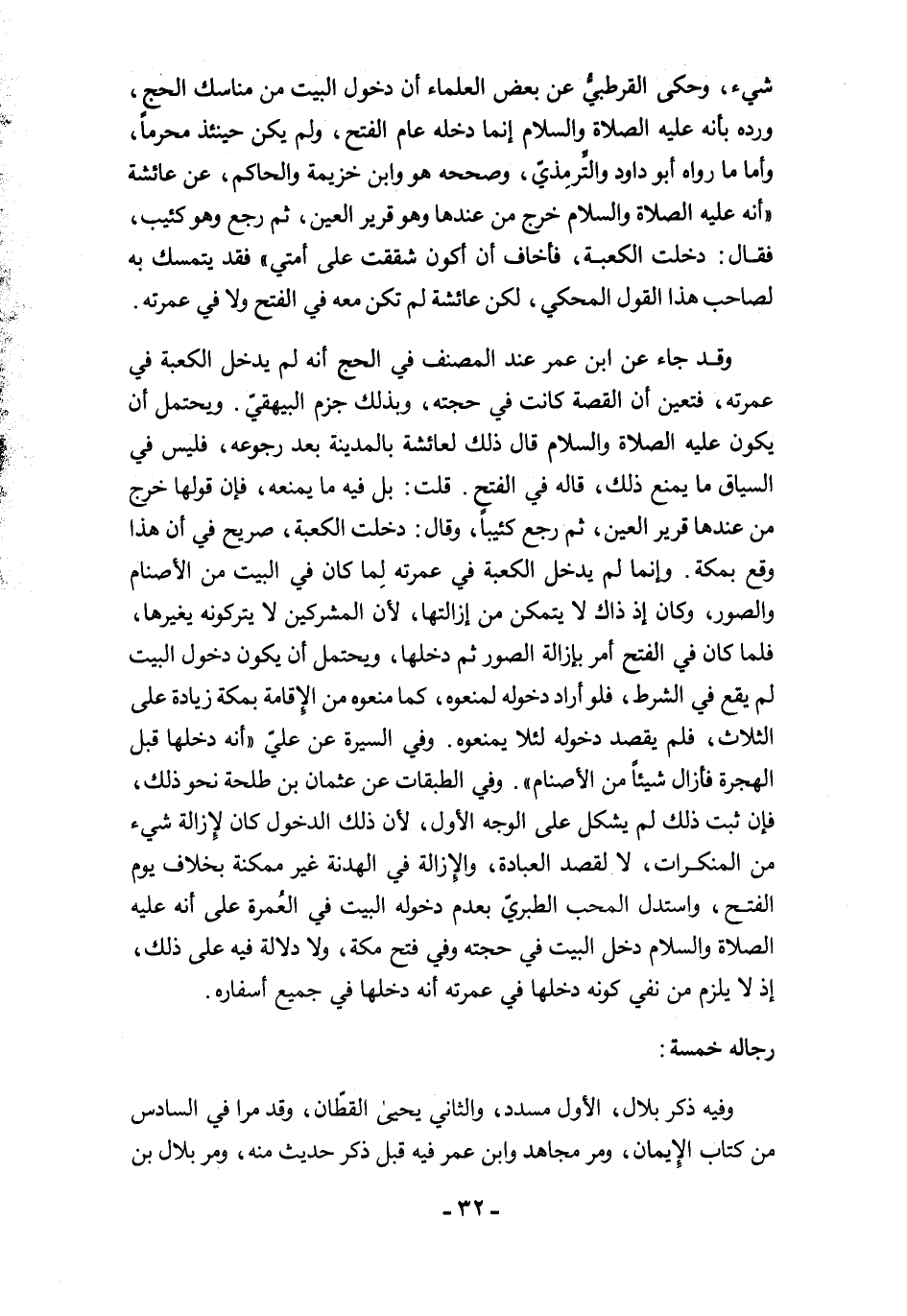 وقد جاء عن ابن عمر عند المصنف في الحج أنه لم يدخل الكعبة في عمرته، فتعين أن القصة كانت في حجته، وبذلك جزم البيهقيّ. ويحتمل أن يكون عليه الصلاة والسلام قال ذلك لعائشة بالمدينة بعد رجوعه، فليس في السياق ما يمنع ذلك، قاله في الفتح. قلت: بل فيه ما يمنعه، فإن قولها خرج من عندها قرير العين، ثم رجع كئيبًا، وقال: دخلت الكعبة، صريح في أن هذا وقع بمكة. وإنما لم يدخل الكعبة في عمرته لِما كان في البيت من الأصنام والصور، وكان إذ ذاك لا يتمكن من إزالتها؛ لأن المشركين لا يتركونه يغيرها، فلما كان في الفتح أمر بإزالة الصور ثم دخلها، ويحتمل أن يكون دخول البيت لم يقع في الشرط، فلو أراد دخوله لمنعوه، كما منعوه من الإقامة بمكة زيادة على الثلاث، فلم يقصد دخوله لئلا يمنعوه. وفي السيرة عن عليّ "أنه دخلها قبل الهجرة فازال شيئًا من الأصنام". وفي الطبقات عن عثمان بن طلحة نحو ذلك، فإن ثبت ذلك لم يشكل على الوجه الأول؛ لأن ذلك الدخول كان لإِزالة شيء من المنكرات، لا لقصد العبادة، والإزالة في الهدنة غير ممكنة بخلاف يوم الفتح، واستدل المحب الطبريّ بعدم دخوله البيت في العُمرة على أنه عليه الصلاة والسلام دخل البيت في حجته وفي فتح مكة، ولا دلالة فيه على ذلك، إذ لا يلزم من نفي كونه دخلها في عمرته أنه دخلها في جميع أسفاره.
