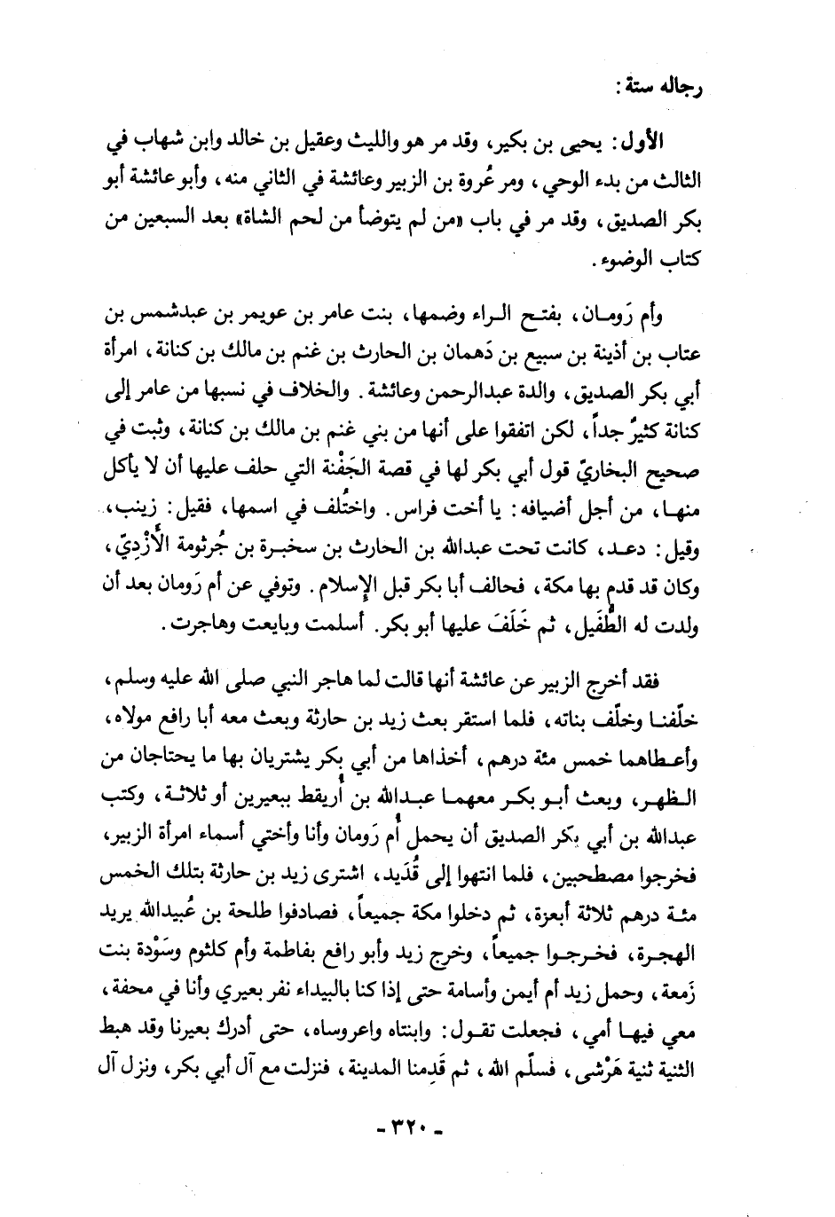 فقد أخرج الزبير عن عائشة أنها قالت لما هاجر النبي صلى الله عليه وسلم، خلّفنا وخلّف بناته، فلما استقر بعث زيد بن حارثة وبعث معه أبا رافع مولاه، وأعطاهما خمس مئة درهم، أخذاها من أبي بكر يشتريان بها ما يحتاجان من الظهر، وبعث أبو بكر معهما عبد الله بن أُريقط ببعيرين أو ثلاثة، وكتب عبد الله بن أبي بكر الصديق أن يحمل أُم رَومان وأنا وأختي أسماء امرأة الزبير، فخرجوا مصطحبين، فلما انتهوا إلى قُدَيد، اشترى زيد بن حارثة بتلك الخمس مئة درهم ثلاثه أبعزة، ثم دخلوا مكة جميعًا، فصادفوا طلحة بن عُبيد الله يريد الهجرة، فخرجوا جميعًا، وخرج زيد وأبو رافع بفاطمة وأم كلثوم وسَوْدة بنت زَمعة، وحمل زيد أم أيمن وأسامة حتى إذا كنا بالبيداء نفر بعيري وأنا في محفة، معي فيها أمي، فجعلت تقول: وابنتاه واعروساه، حتى أدرك بعيرنا وقد هبط الثنية ثنية هَرْشى، فسلّم الله، ثم قَدِمنا المدينة، فنزلت مع آل أبي بكر، ونزل آل