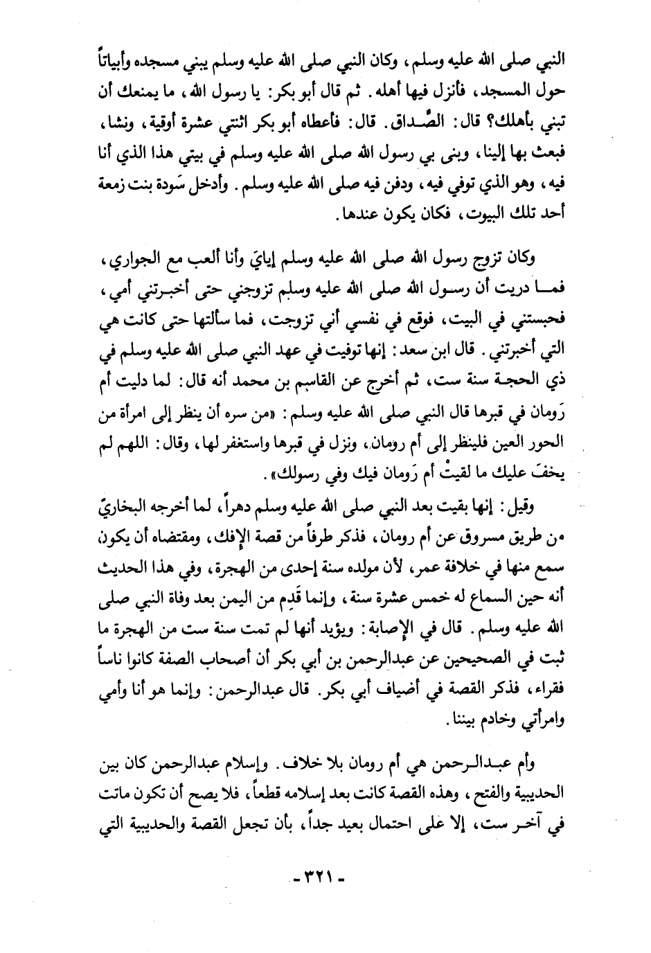 وأم عبد الرحمن هي أم رومان بلا خلاف. وإسلام عبد الرحمن كان بين الحديبية والفتح، وهذه القصة كانت بعد إسلامه قطعًا، فلا يصح أن تكون ماتت في آخر ست، إلا على احتمال بعيد جدًا، بأن تجعل القصة والحديبية التي