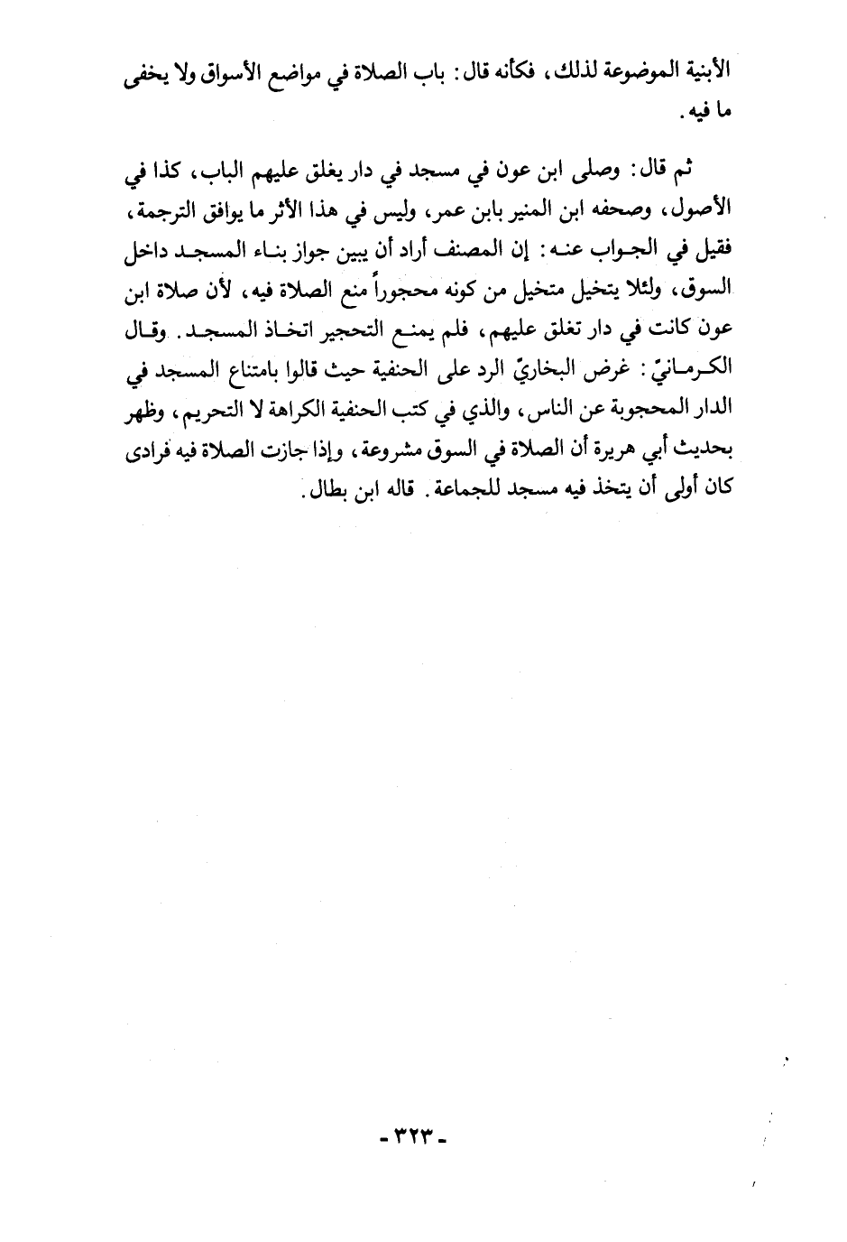ثم قال: وصلى ابن عون في مسجد في دار يغلق عليهم الباب، كذا في الأصول، وصحفه ابن المنير بابن عمر، وليس في هذا الأثر ما يوافق الترجمة، فقيل في الجواب عنه: إِن المصنف أراد أن يبين جواز بناء المسجد داخل السوق، ولئلا يتخيل متخيل من كونه محجورًا منع الصلاة فيه؛ لأن صلاة ابن عون كانت في دار تغلق عليهم، فلم يمنع التحجير اتخاذ المسجد. وقال الكرمانيّ: غرض البخاريّ الرد على الحنفية حيث قالوا بامتناع المسجد في الدار المحجوبة عن الناس، والذي في كتب الحنفية الكراهة لا التحريم، وظهر بحديث أبي هريرة أن الصلاة في السوق مشروعة، وإذا جازت الصلاة فيه فرادى كان أولى أن يتخذ فيه مسجد للجماعة. قاله ابن بطال.