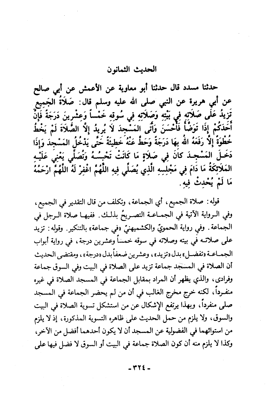 حَدَّثَنَا مُسَدَّدٌ قَالَ حَدَّثَنَا أَبُو مُعَاوِيَةَ عَنِ الأَعْمَشِ عَنْ أَبِي صَالِحٍ عَنْ أَبِي هُرَيْرَةَ عَنِ النَّبِيِّ -صلى الله عليه وسلم- قَالَ: صَلاَةُ الْجَمِيعِ تَزِيدُ عَلَى صَلاَتِهِ فِي بَيْتِهِ، وَصَلاَتِهِ فِي سُوقِهِ خَمْسًا وَعِشْرِينَ دَرَجَةً، فَإِنَّ أَحَدَكُمْ إِذَا تَوَضَّأَ فَأَحْسَنَ وَأَتَى الْمَسْجِدَ، لاَ يُرِيدُ إِلاَّ الصَّلاَةَ، لَمْ يَخْطُ خُطْوَةً إِلاَّ رَفَعَهُ اللَّهُ بِهَا دَرَجَةً، وَحَطَّ عَنْهُ خَطِيئَةً، حَتَّى يَدْخُلَ الْمَسْجِدَ، وَإِذَا دَخَلَ الْمَسْجِدَ كَانَ فِي صَلاَةٍ مَا كَانَتْ تَحْبِسُهُ، وَتُصَلِّي يَعْنِي عَلَيْهِ الْمَلاَئِكَةُ مَا دَامَ فِي مَجْلِسِهِ الَّذِى يُصَلِّي فِيهِ اللَّهُمَّ اغْفِرْ لَهُ، اللَّهُمَّ ارْحَمْهُ، مَا لَمْ يُحْدِثْ فِيهِ.