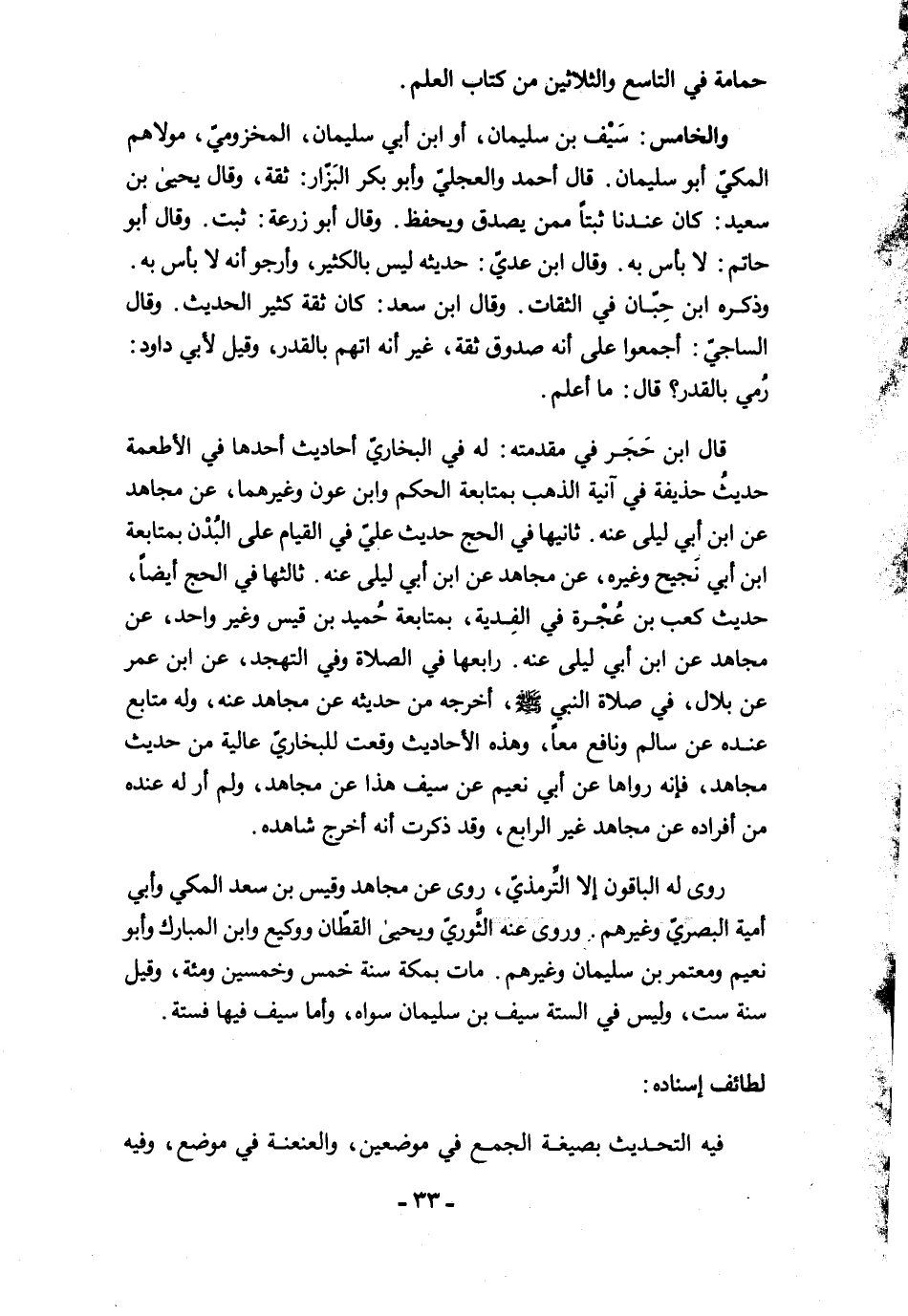 والخامس: سَيْف بن سليمان، أو ابن أبي سليمان، المخزوميّ، مولاهم المكيّ أبو سليمان. قال أحمد والعجليّ وأبو بكر البَزّار: ثقة، وقال يحيى بن سعيد: كان عندنا ثبتًا ممن يصدق ويحفظ. وقال أبو زرعة: ثبت. وقال أبو حاتم: لا بأس به. وقال ابن عديّ: حديثه ليس بالكثير، وأرجو أنه لا بأس به. وذكره ابن حِبّان في الثقات. وقال ابن سعد: كان ثقة كثير الحديث. وقال الساجيّ: أجمعوا على أنه صدوق ثقة، غير أنه اتهم بالقدر، وقيل لأبي داود: رُمي بالقدر؟ قال: ما أعلم.
