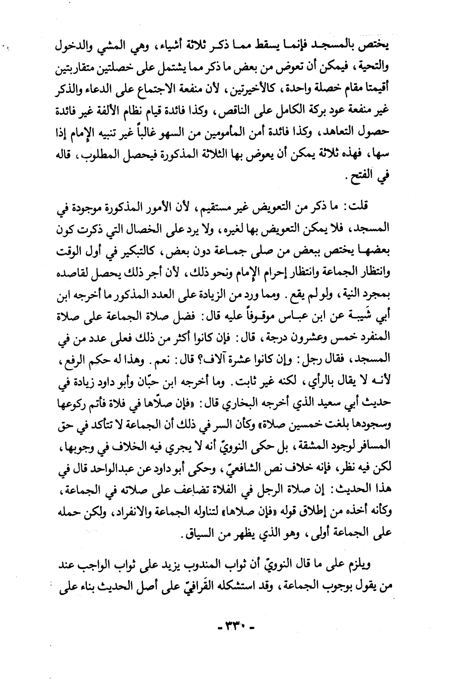 قلت: ما ذكر من التعويض غير مستقيم؛ لأن الأمور المذكورة موجودة في المسجد، فلا يمكن التعويض بها لغيره، ولا يرد على الخصال التي ذكرت كون بعضها يختص ببعض من صلى جماعة دون بعض، كالتبكير في أول الوقت وانتظار الجماعة وانتظار إحرام الإِمام ونحو ذلك؛ لأن أجر ذلك يحصل لقاصده بمجرد النية، ولو لم يقع. ومما ورد من الزيادة على العدد المذكور ما أخرجه ابن أبي شَيبة عن ابن عباس موقوفًا عليه قال: فضل صلاة الجماعة على صلاة المنفرد خمس وعشرون درجة، قال: فإن كانوا أكثر من ذلك فعلى عدد من في المسجد، فقال رجل: وإن كانوا عشرة آلاف؟ قال: نعم. وهذا له حكم الرفع، لأنه لا يقال بالرأي، لكنه غير ثابت. وما أخرجه ابن حبان وأبو داود زيادة في حديث أبي سعيد الذي أخرجه البخاري قال: "فإن صلاّها في فلاة فأتم ركوعها وسجودها بلغت خمسين صلاة" وكأن السر في ذلك أن الجماعة لا تتأكد في حق المسافر لوجود المشقة، بل حكى النوويّ أنه لا يجري فيه الخلاف في وجوبها، لكن فيه نظر، فإنه خلاف نص الشافعيّ، وحكى أبو داود عن عبد الواحد قال في هذا الحديث: إن صلاة الرجل في الفلاة تضاعف على صلاته في الجماعة، وكأنه أخذه من إطلاق قوله "فإن صلاها" لتناوله الجماعة والانفراد، ولكن حمله على الجماعة أولى، وهو الذي يظهر من السياق.