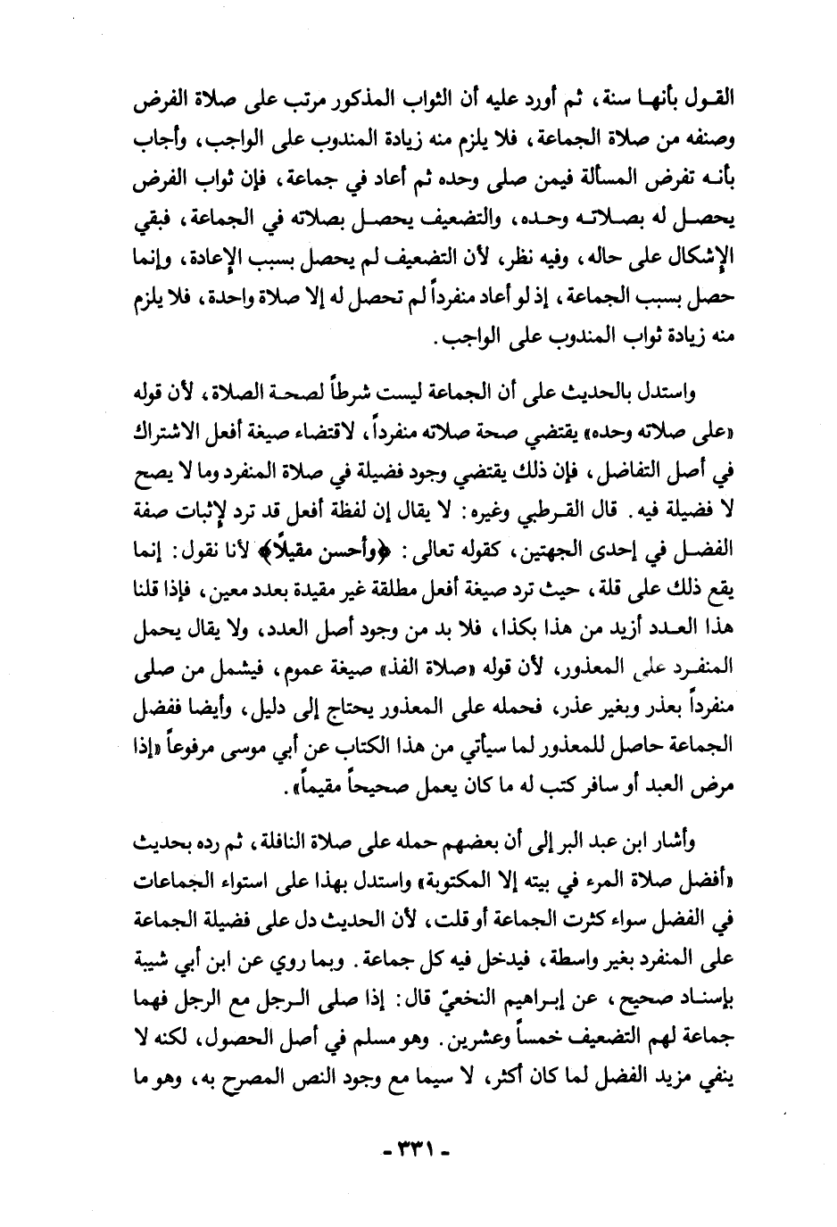 واستدل بالحديث على أن الجماعة ليست شرطًا لصحة الصلاة, لأن قوله "على صلاته وحده" يقتضي صحة صلائه منفردًا، لاقتضاء صيغة أفعل الاشتراك في أصل التفاضل، فإن ذلك يقتضي وجود فضيلة في صلاة المنفرد وما لا يصح لا فضيلة فيه. قال القرطبي وغيره: لا يقال إن لفظة أفعل قد ترد لإثبات صفة الفضل في إحدى الجهتين، كقوله تعالى: {وَأَحْسَنُ مَقِيلًا} لأنا نقول: إنما يقع ذلك على قلة، حيث ترد صيغة أفعل مطلقة غير مقيدة بعدد معين، فإذا قلنا هذا العدد أزيد من هذا بكذا، فلابد من وجود أصل العدد، ولا يقال يحمل المنفرد علي، المعذور؛ لأن قوله "صلاة الفذ" صيغة عموم، فيشمل من صلى منفردًا بعذر ويغير عذر، فتحمله على المعذور يحتاج إلى دليل، وأيضًا ففضل الجماعة حاصل للمعذور لما سيأتي من هذا الكتاب عن أبي موسى مرفوعًا "إذا مرض العبد أو سافر كتب له ما كان يعمل صحيحًا مقيمًا".
