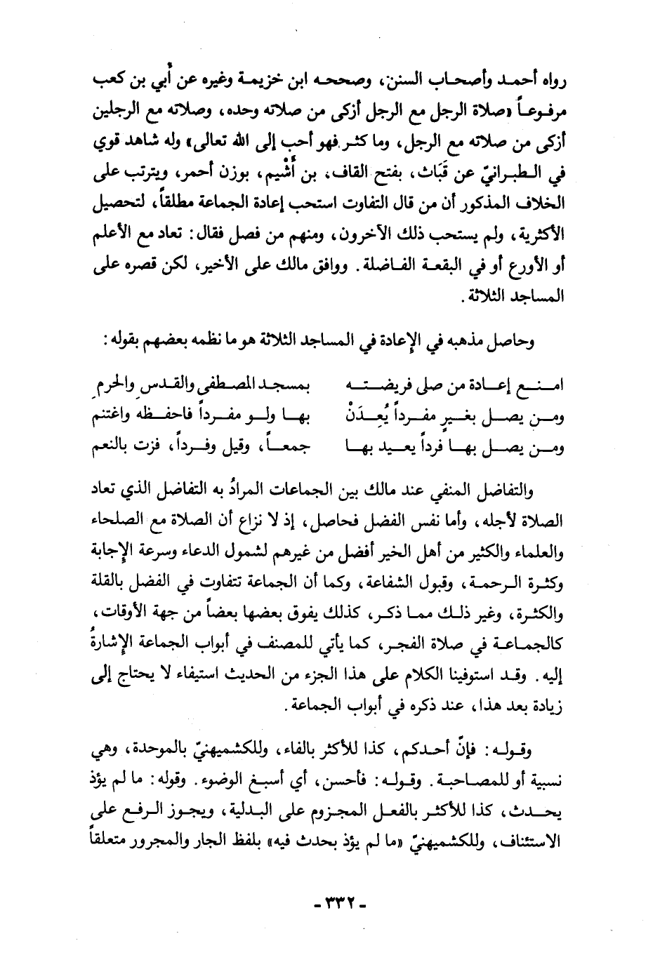 وحاصل مذهبه في الإعادة في المساجد الثلاثة هو ما نظمه بعضهم بقوله: