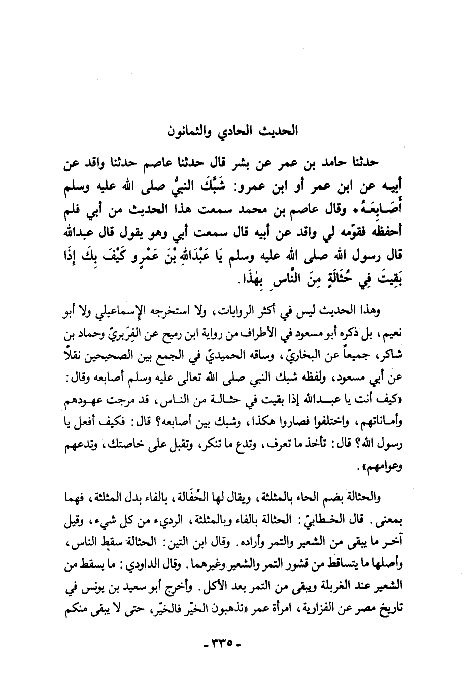 حَدَّثَنَا حَامِدُ بْنُ عُمَرَ عَنْ بِشْرٍ حَدَّثَنَا عَاصِمٌ حَدَّثَنَا وَاقِدٌ عَنْ أَبِيهِ عَنِ ابْنِ عُمَرَ أَوِ ابْنِ عَمْرو: شَبَّكَ النَّبِيُّ -صلى الله عليه وسلم- أَصَابِعَهُ. * وَقَالَ عَاصِمُ بْنُ مُحَمَّدٍ سَمِعْتُ هَذَا الْحَدِيثَ مِنْ أَبِي فَلَمْ أَحْفَظْهُ، فَقَوَّمَهُ لِي وَاقِدٌ عَنْ أَبِيهِ قَالَ سَمِعْتُ أَبِي وَهُوَ يَقُولُ قَالَ عَبْدُ اللَّهِ قَالَ رَسُولُ اللَّهِ -صلى الله عليه وسلم- يَا عَبْدَ اللَّهِ بْنَ عَمْرو، كَيْفَ بِكَ إِذَا بَقِيتَ فِي حُثَالَةٍ مِنَ النَّاسِ بِهَذَا.
