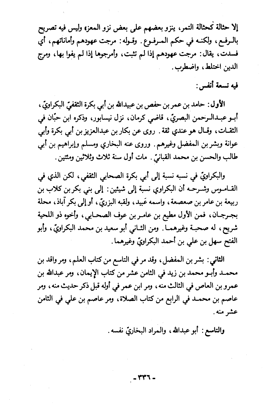 الأول: حامد بن عمر بن حفص بن عبيد الله بن أبي بكرة الثقفيّ البكراويّ، أبو عبد الرحمن البصريّ، قاضي كرمان، نزل نيسابور، وذكره ابن حبّان في الثقات، وقال هو عندي ثقة. روى عن بكار بن عبد العزيز بن أبي بكرة وأبي عوانة وبشر بن المفضل وغيرهم. وروى عنه البخاري ومسلم وإبراهيم بن أبي طالب والحسن بن محمد القبانيّ. مات أول سنة ثلاث وثلاثين ومئتين.