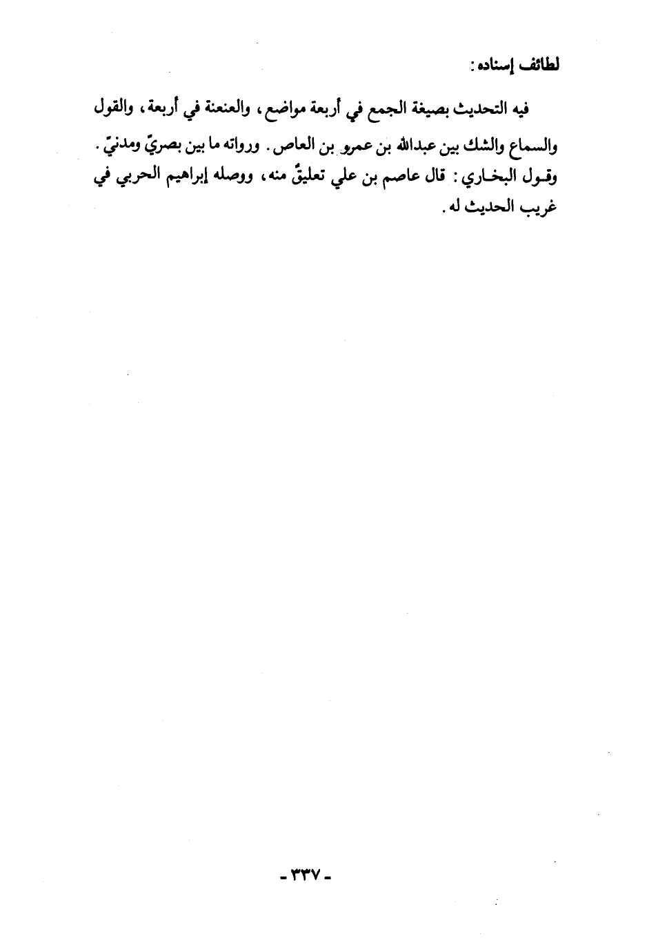 فيه التحديث بصيغة الجمع في أربعة مواضع، والعنعنة في أربعة، والقول والسماع والشك بين عبد الله بن عمرو بن العاص. ورواته ما بين بصريّ ومدنيّ. وقول البخاري: قال عاصم بن علي تعليقٌ منه، ووصله إبراهيم الحربي في غريب الحديث له.