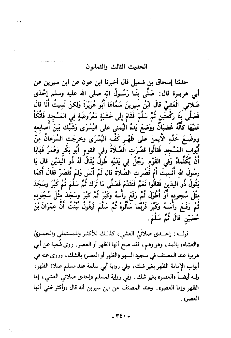 حَدَّثَنَا إِسْحَاقُ ابْنُ شُمَيْلٍ أَخْبَرَنَا ابْنُ عَوْنٍ عَنِ ابْنِ سِيرِينَ عَنْ أَبِي هُرَيْرَةَ قَالَ: صَلَّى بِنَا رَسُولُ اللَّهِ -صلى الله عليه وسلم- إِحْدَى صَلاَتَيِ الْعَشِيِّ قَالَ ابْنُ سِيرِينَ سَمَّاهَا أَبُو هُرَيْرَةَ وَلَكِنْ نَسِيتُ أَنَا قَالَ فَصَلَّى بِنَا رَكْعَتَيْنِ ثُمَّ سَلَّمَ، فَقَامَ إِلَى خَشَبَةٍ مَعْرُوضَةٍ فِي الْمَسْجِدِ فَاتَّكَأَ عَلَيْهَا، كَأَنَّهُ غَضْبَانُ، وَوَضَعَ يَدَهُ الْيُمْنَى عَلَى الْيُسْرَى، وَشَبَّكَ بَيْنَ أَصَابِعِهِ، وَوَضَعَ خَدَّهُ الأَيْمَنَ عَلَى ظَهْرِ كَفِّهِ الْيُسْرَى، وَخَرَجَتِ السَّرَعَانُ مِنْ أَبْوَابِ الْمَسْجِدِ فَقَالُوا قَصُرَتِ الصَّلاَةُ. وَفِي الْقَوْمِ أَبُو بَكْرٍ وَعُمَرُ، فَهَابَا أَنْ يُكَلِّمَاهُ، وَفِي الْقَوْمِ رَجُلٌ فِي يَدَيْهِ طُولٌ يُقَالُ لَهُ ذُو الْيَدَيْنِ قَالَ يَا رَسُولَ اللَّهِ، أَنَسِيتَ أَمْ قَصُرَتِ الصَّلاَةُ قَالَ لَمْ أَنْسَ، وَلَمْ تُقْصَرْ. فَقَالَ أَكَمَا يَقُولُ ذُو الْيَدَيْنِ. فَقَالُوا نَعَمْ. فَتَقَدَّمَ فَصَلَّى مَا تَرَكَ، ثُمَّ سَلَّمَ، ثُمَّ كَبَّرَ وَسَجَدَ مِثْلَ سُجُودِهِ أَوْ أَطْوَلَ، ثُمَّ رَفَعَ رَأْسَهُ وَكَبَّرَ، ثُمَّ كَبَّرَ وَسَجَدَ مِثْلَ سُجُودِهِ أَوْ أَطْوَلَ، ثُمَّ رَفَعَ رَأْسَهُ وَكَبَّرَ. فَرُبَّمَا سَأَلُوهُ ثُمَّ سَلَّمَ فَيَقُولُ نُبِّئْتُ أَنَّ عِمْرَانَ بْنَ حُصَيْنٍ قَالَ ثُمَّ سَلَّمَ.