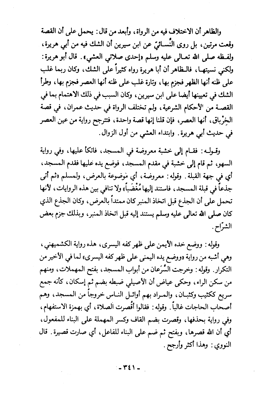 والظاهر أن الاختلاف فيه من الرواة، وأبعد من قال: يحمل على أن القصة وقعت مرتين، بل روى النَّسائيّ عن ابن سيرين أن الشك فيه من أبي هريرة، ولفظه صلى الله تعالى عليه وسلم "إحدى صلاتي العشي". قال أبو هريرة: ولكني نسيتها، فالظاهر أن أبا هريرة رواه كثيرًا على الشك، وكان ربما غلب على ظنه أنها الظهر فجزم بها، وتارة غلب على ظنه أنها العصر فجزم بها، وطرأ الشك في تعيينها أيضًا على ابن سيرين، وكان السبب في ذلك الاهتمام بما في القصة من الأحكام الشرعية، ولم تختلف الرواة في حديث عمران، في قصة الخِرْباق، أنها العصر، فإن قلنا إنها قصة واحدة، فتترجح رواية من عين العصر في حديث أبي هريرة. وابتداء العشي من أول الزوال.
