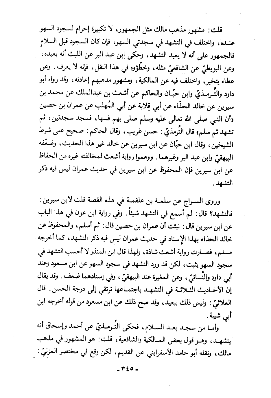 وروى السراج عن سلمة بن علقمة في هذه القصة قلت لابن سيرين: فالتشهد؟ قال: لم أسمع في التشهد شيئًا. وفي رواية ابن عون في هذا الباب عن ابن سيرين قال: نبئت أن عمران بن حصين قال: ثم أسلم، والمحفوظ عن خالد الحذاء بهذا الإسناد في حديث عمران ليس فيه ذكر التشهد، كما أخرجه مسلم، فصارت رواية أشعث شاذة، ولهذا قال ابن المنذر لا أحسب التشهد في سجود السهو يثبت، لكن قد ورد التشهد في سجود السهو عن ابن مسعود وعند أبي داود والنَّسائيّ، وعن المغيرة عند البيهقيّ، وفي إسنادهما ضعف. وقد يقال ان الأحاديث الثلاثة في التشهد باجتماعها ترتقي إلى درجة الحسن. قال العلائيّ: وليس ذلك ببعيد، وقد صح ذلك عن ابن مسعود من قوله أخرجه ابن أبي شيبة.