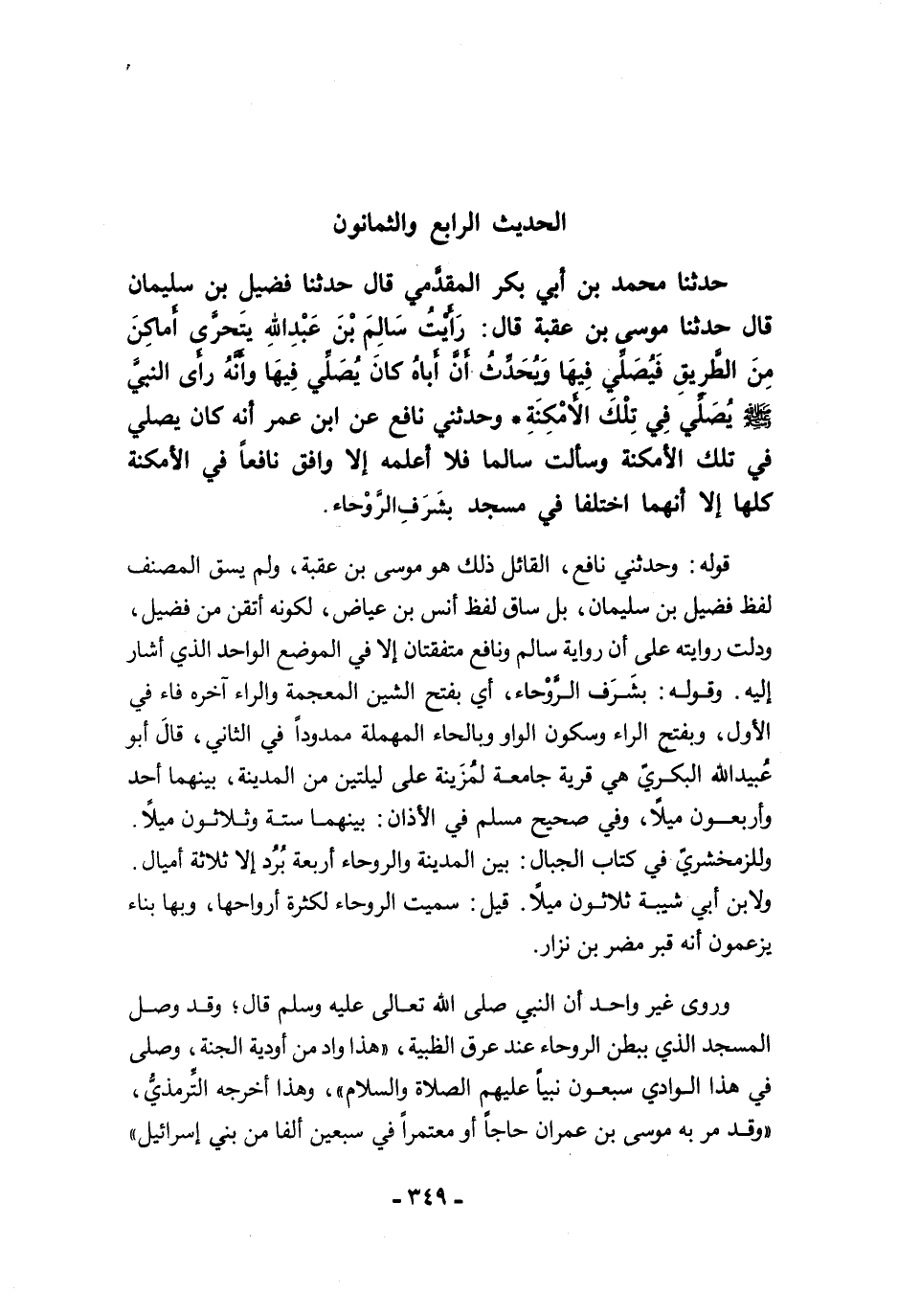 حَدَّثَنَا مُحَمَّدُ بْنُ أَبِي بَكْرٍ الْمُقَدَّمِىُّ قَالَ حَدَّثَنَا فُضَيْلُ بْنُ سُلَيْمَانَ قَالَ حَدَّثَنَا مُوسَى بْنُ عُقْبَةَ قَالَ: رَأَيْتُ سَالِمَ بْنَ عَبْدِ اللَّهِ يَتَحَرَّى أَمَاكِنَ مِنَ الطَّرِيقِ فَيُصَلِّي فِيهَا، وَيُحَدِّثُ أَنَّ أَبَاهُ كَانَ يُصَلِّي فِيهَا، وَأَنَّهُ رَأَى النَّبِيَّ -صلى الله عليه وسلم- يُصَلِّي فِى تِلْكَ الأَمْكِنَةِ * وَحَدَّثَنِي نَافِعٌ عَنِ ابْنِ عُمَرَ أَنَّهُ كَانَ يُصَلِّي فِي تِلْكَ الأَمْكِنَةِ. وَسَأَلْتُ سَالِمًا، فَلاَ أَعْلَمُهُ إِلاَّ وَافَقَ نَافِعًا فِي الأَمْكِنَةِ كُلِّهَا إِلاَّ أَنَّهُمَا اخْتَلَفَا فِي مَسْجِدٍ بِشَرَفِ الرَّوْحَاءِ.