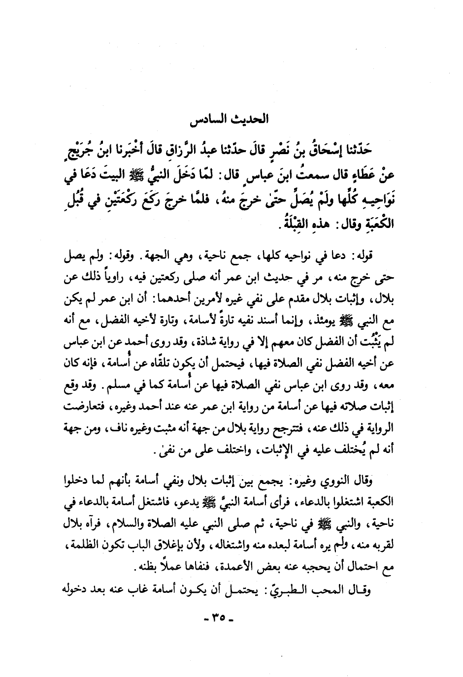 وقال النووي وغيره: يجمع بين إثبات بلال ونفي أسامة بانهم لما دخلوا الكعبة اشتغلوا بالدعاء، فرأى أسامة النبيَّ -صلى الله عليه وسلم- يدعو، فاشتغل أسامة بالدعاء في ناحية، والنبي -صلى الله عليه وسلم- في ناحية، ثم صلى النبي عليه الصلاة والسلام، فرآه بلال لقربه منه، ولم يره أسامة لبعده منه واشتغاله، ولأن بإغلاق الباب تكون الظلمة، مع احتمال أن يحجبه عنه بعض الأعمدة، فنفاها عملًا بظنه.