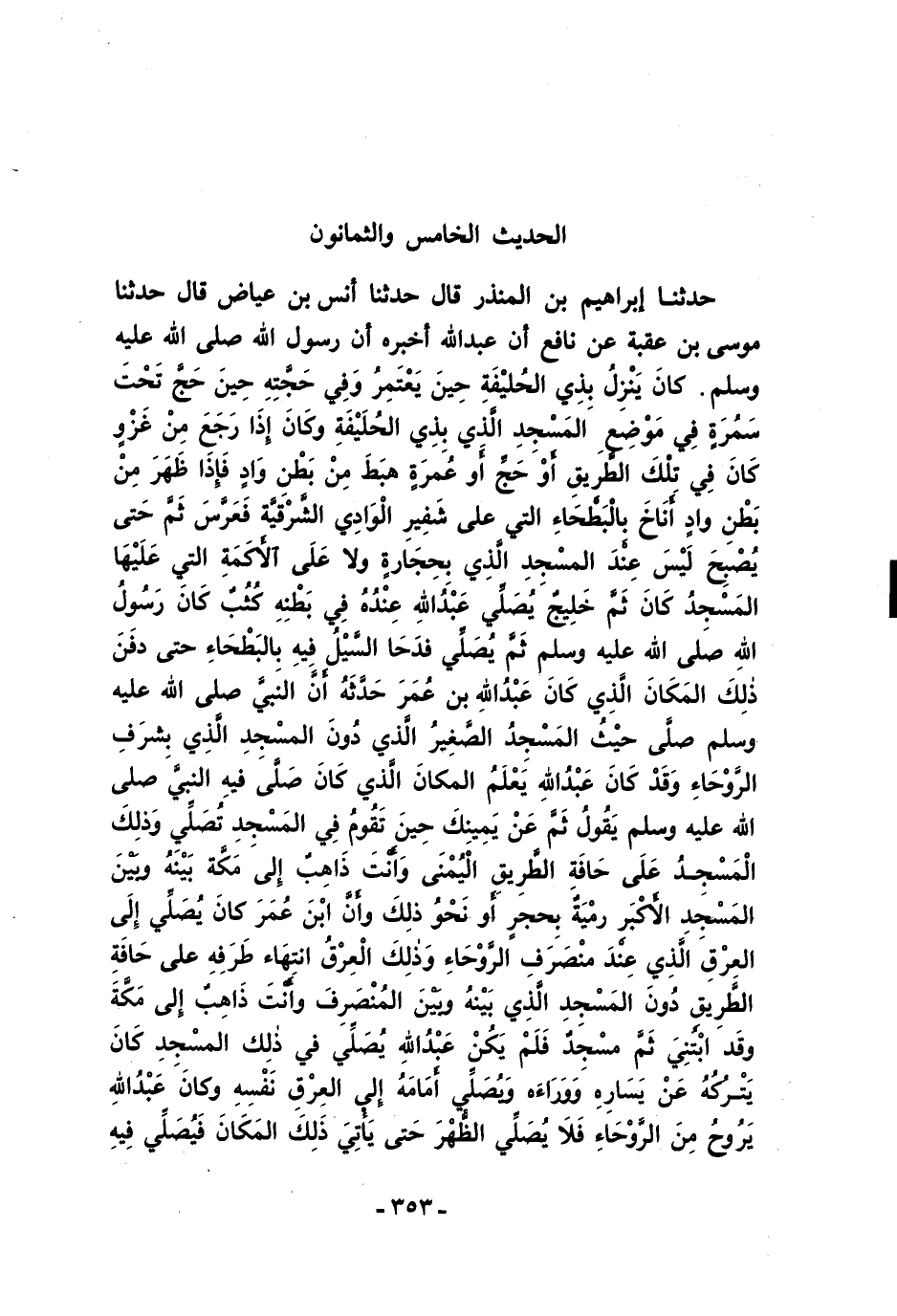 حَدَّثَنَا إِبْرَاهِيمُ بْنُ الْمُنْذِرِ قَالَ حَدَّثَنَا أَنَسُ بْنُ عِيَاضٍ قَالَ حَدَّثَنَا مُوسَى بْنُ عُقْبَةَ عَنْ نَافِعٍ أَنَّ عَبْدَ اللَّهِ أَخْبَرَهُ أَنَّ رَسُولَ اللَّهِ -صلى الله عليه وسلم- كَانَ يَنْزِلُ بِذِي الْحُلَيْفَةِ حِينَ يَعْتَمِرُ، وَفِي حَجَّتِهِ حِينَ حَجَّ، تَحْتَ سَمُرَةٍ فِي مَوْضِعِ الْمَسْجِدِ الَّذِي بِذِي الْحُلَيْفَةِ، وَكَانَ إِذَا رَجَعَ مِنْ غَزْوٍ كَانَ فِي تِلْكَ الطَّرِيقِ أَوْ حَجٍّ أَوْ عُمْرَةٍ هَبَطَ مِنْ بَطْنِ وَادٍ، فَإِذَا ظَهَرَ مِنْ بَطْنِ وَادٍ أَنَاخَ بِالْبَطْحَاءِ الَّتِي عَلَى شَفِيرِ الْوَادِى الشَّرْقِيَّةِ، فَعَرَّسَ ثَمَّ حَتَّى يُصْبِحَ، لَيْسَ عِنْدَ الْمَسْجِدِ الَّذِي بِحِجَارَةٍ، وَلاَ عَلَى الأَكَمَةِ الَّتِي عَلَيْهَا الْمَسْجِدُ، كَانَ ثَمَّ خَلِيجٌ يُصَلِّي عَبْدُ اللَّهِ عِنْدَهُ، فِي بَطْنِهِ كُثُبٌ كَانَ رَسُولُ اللَّهِ -صلى الله عليه وسلم- ثَمَّ يُصَلِّي، فَدَحَا السَّيْلُ فِيهِ بِالْبَطْحَاءِ حَتَّى دَفَنَ ذَلِكَ الْمَكَانَ الَّذِى كَانَ عَبْدُ اللَّهِ بن عُمَرَ أَنَّ النَّبِيَّ -صلى الله عليه وسلم- صَلَّى حَيْثُ الْمَسْجِدُ الصَّغِيرُ الَّذِي دُونَ الْمَسْجِدِ الَّذِي بِشَرَفِ الرَّوْحَاءِ، وَقَدْ كَانَ عَبْدُ اللَّهِ يَعْلَمُ الْمَكَانَ الَّذِى كَانَ صَلَّى فِيهِ النَّبِيُّ -صلى الله عليه وسلم- يَقُولُ ثَمَّ عَنْ يَمِينِكَ حِينَ تَقُومُ فِي الْمَسْجِدِ تُصَلِّي، وَذَلِكَ الْمَسْجِدُ عَلَى حَافَةِ الطَّرِيقِ الْيُمْنَى، وَأَنْتَ ذَاهِبٌ إِلَى مَكَّةَ، بَيْنَهُ وَبَيْنَ الْمَسْجِدِ الأَكْبَرِ رَمْيَةٌ بِحَجَرٍ أَوْ نَحْوُ ذَلِكَ. وَأَنَّ ابْنَ عُمَرَ كَانَ يُصَلِّي إِلَى الْعِرْقِ الَّذِي عِنْدَ مُنْصَرَفِ الرَّوْحَاءِ، وَذَلِكَ الْعِرْقُ انْتِهَاءُ طَرَفِهِ عَلَى حَافَةِ الطَّرِيقِ، دُونَ الْمَسْجِدِ الَّذِي بَيْنَهُ وَبَيْنَ الْمُنْصَرَفِ، وَأَنْتَ ذَاهِبٌ إِلَى مَكَّةَ. وَقَدِ ابْتُنِيَ ثَمَّ مَسْجِدٌ، فَلَمْ يَكُنْ عَبْدُ اللَّهِ يُصَلِّي فِي ذَلِكَ الْمَسْجِدِ، كَانَ يَتْرُكُهُ عَنْ يَسَارِهِ وَوَرَاءَهُ، وَيُصَلِّي أَمَامَهُ إِلَى الْعِرْقِ نَفْسِهِ، وَكَانَ عَبْدُ اللَّهِ يَرُوحُ مِنَ الرَّوْحَاءِ، فَلاَ يُصَلِّي الظُّهْرَ حَتَّى يَأْتِيَ ذَلِكَ الْمَكَانَ فَيُصَلِّي فِيهِ