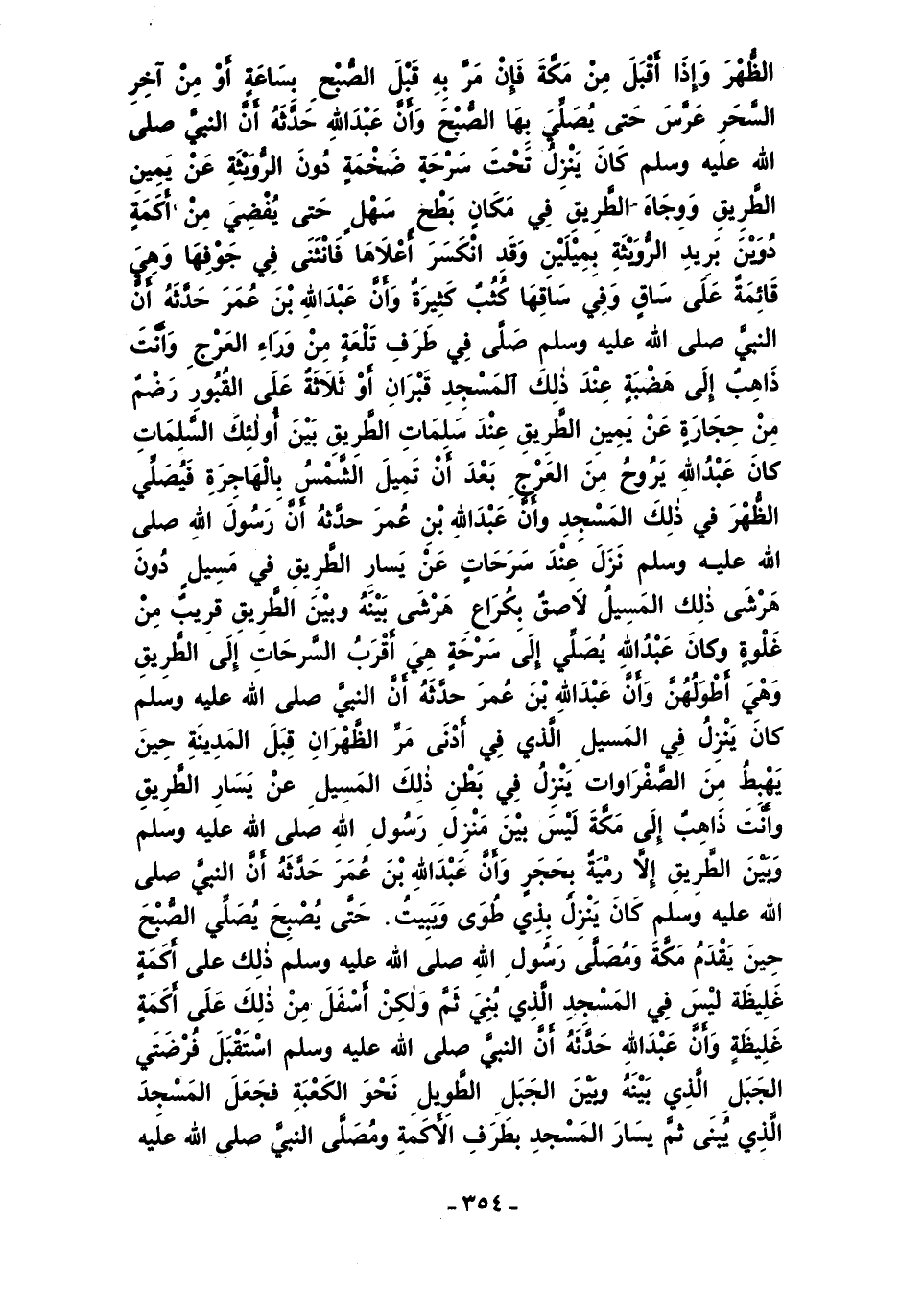 الظُّهْرَ، وَإِذَا أَقْبَلَ مِنْ مَكَّةَ فَإِنْ مَرَّ بِهِ قَبْلَ الصُّبْحِ بِسَاعَةٍ أَوْ مِنْ آخِرِ السَّحَرِ عَرَّسَ حَتَّى يُصَلِّيَ بِهَا الصُّبْحَ. وَأَنَّ عَبْدَ اللَّهِ حَدَّثَهُ أَنَّ النَّبِيَّ -صلى الله عليه وسلم- كَانَ يَنْزِلُ تَحْتَ سَرْحَةٍ ضَخْمَةٍ دُونَ الرُّوَيْثَةِ عَنْ يَمِينِ الطَّرِيقِ، وَوِجَاهَ الطَّرِيقِ فِي مَكَانٍ بَطْحٍ سَهْلٍ، حَتَّى يُفْضِيَ مِنْ أَكَمَةٍ دُوَيْنَ بَرِيدِ الرُّوَيْثَةِ بِمِيلَيْنِ، وَقَدِ انْكَسَرَ أَعْلاَهَا، فَانْثَنَى فِي جَوْفِهَا، وَهِيَ قَائِمَةٌ عَلَى سَاقٍ، وَفِي سَاقِهَا كُثُبٌ كَثِيرَةٌ. وَأَنَّ عَبْدَ اللَّهِ بْنَ عُمَرَ حَدَّثَهُ أَنَّ النَّبِيَّ -صلى الله عليه وسلم- صَلَّى فِي طَرَفِ تَلْعَةٍ مِنْ وَرَاءِ الْعَرْجِ وَأَنْتَ ذَاهِبٌ إِلَى هَضْبَةٍ عِنْدَ ذَلِكَ الْمَسْجِدِ قَبْرَانِ أَوْ ثَلاَثَةٌ، عَلَى الْقُبُورِ رَضْمٌ مِنْ حِجَارَةٍ عَنْ يَمِينِ الطَّرِيقِ، عِنْدَ سَلِمَاتِ الطَّرِيقِ، بَيْنَ أُولَئِكَ السَّلِمَاتِ كَانَ عَبْدُ اللَّهِ يَرُوحُ مِنَ الْعَرْجِ بَعْدَ أَنْ تَمِيلَ الشَّمْسُ بِالْهَاجِرَةِ، فَيُصَلِّي الظُّهْرَ فِي ذَلِكَ الْمَسْجِدِ. وَأَنَّ عَبْدَ اللَّهِ بْنَ عُمَرَ حَدَّثَهُ أَنَّ رَسُولَ اللَّهِ -صلى الله عليه وسلم- نَزَلَ عِنْدَ سَرَحَاتٍ عَنْ يَسَارِ الطَّرِيقِ، فِي مَسِيلٍ دُونَ هَرْشَى، ذَلِكَ الْمَسِيلُ لاَصِقٌ بِكُرَاعِ هَرْشَى، بَيْنَهُ وَبَيْنَ الطَّرِيقِ قَرِيبٌ مِنْ غَلْوَةٍ، وَكَانَ عَبْدُ اللَّهِ يُصَلِّي إِلَى سَرْحَةٍ، هِيَ أَقْرَبُ السَّرَحَاتِ إِلَى الطَّرِيقِ وَهْىَ أَطْوَلُهُنَّ. وَأَنَّ عَبْدَ اللَّهِ بْنَ عُمَرَ حَدَّثَهُ أَنَّ النَّبِيَّ -صلى الله عليه وسلم- كَانَ يَنْزِلُ فِي الْمَسِيلِ الَّذِي فِي أَدْنَى مَرِّ الظَّهْرَانِ، قِبَلَ الْمَدِينَةِ حِينَ يَهْبِطُ مِنَ الصَّفْرَاوَاتِ يَنْزِلُ فِي بَطْنِ ذَلِكَ الْمَسِيلِ عَنْ يَسَارِ الطَّرِيقِ، وَأَنْتَ ذَاهِبٌ إِلَى مَكَّةَ، لَيْسَ بَيْنَ مَنْزِلِ رَسُولِ اللَّهِ -صلى الله عليه وسلم- وَبَيْنَ الطَّرِيقِ إِلاَّ رَمْيَةٌ بِحَجَرٍ. وَأَنَّ عَبْدَ اللَّهِ بْنَ عُمَرَ حَدَّثَهُ أَنَّ النَّبِيَّ -صلى الله عليه وسلم- كَانَ يَنْزِلُ بِذِي طُوًى وَيَبِيتُ حَتَّى يُصْبِحَ، يُصَلِّي الصُّبْحَ حِينَ يَقْدَمُ مَكَّةَ، وَمُصَلَّى رَسُولِ اللَّهِ -صلى الله عليه وسلم- ذَلِكَ عَلَى أَكَمَةٍ غَلِيظَةٍ، لَيْسَ فِي الْمَسْجِدِ الَّذِي بُنِيَ ثَمَّ، وَلَكِنْ أَسْفَلَ مِنْ ذَلِكَ عَلَى أَكَمَةٍ غَلِيظَةٍ. وَأَنَّ عَبْدَ اللَّهِ حَدَّثَهُ أَنَّ النَّبِيَّ -صلى الله عليه وسلم- اسْتَقْبَلَ فُرْضَتَيِ الْجَبَلِ الَّذِي بَيْنَهُ وَبَيْنَ الْجَبَلِ الطَّوِيلِ نَحْوَ الْكَعْبَةِ، فَجَعَلَ الْمَسْجِدَ الَّذِي يُبنِىَ ثَمَّ يَسَارَ الْمَسْجِدِ بِطَرَفِ الأَكَمَةِ، وَمُصَلَّى النَّبِيِّ -صلى الله عليه