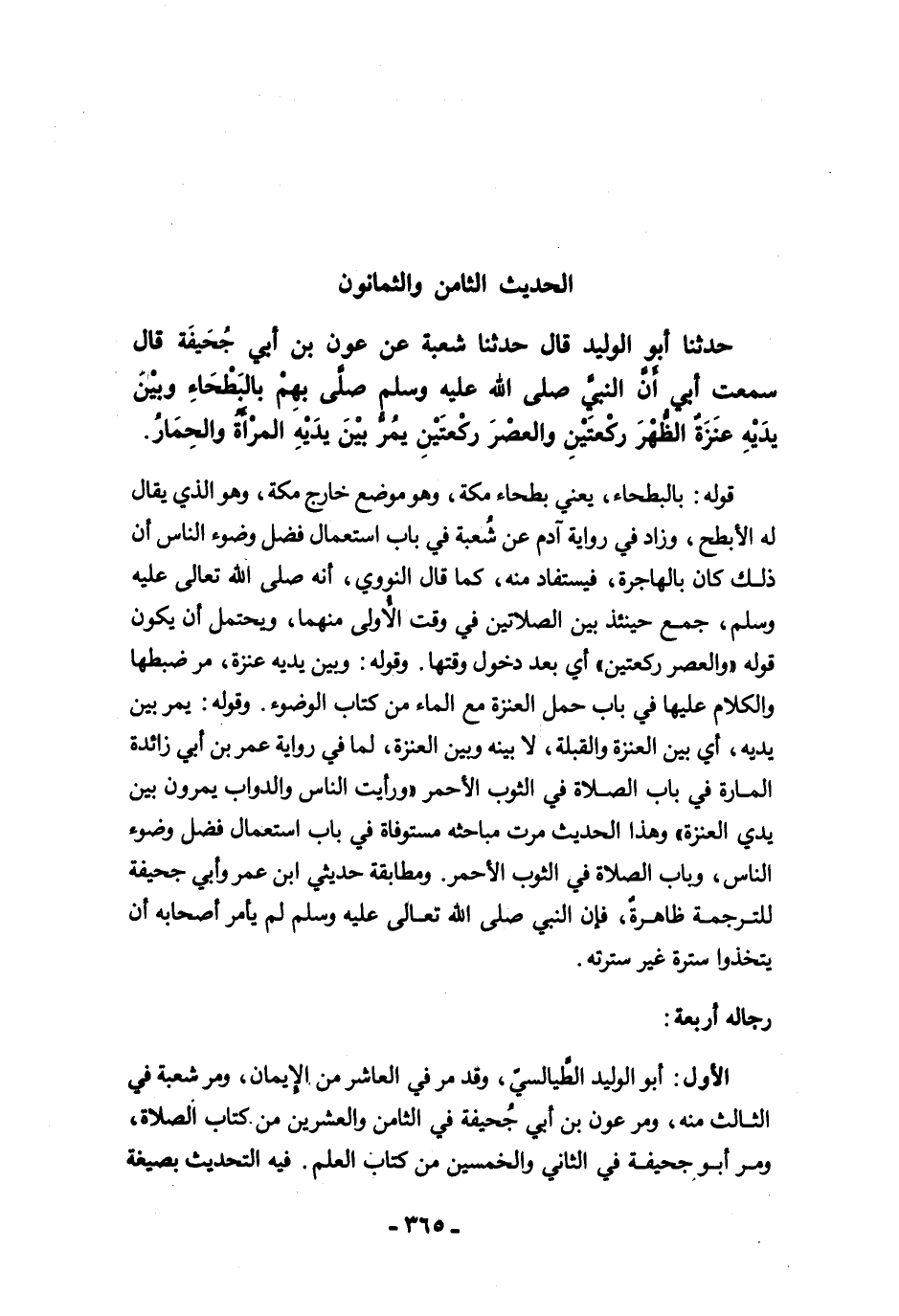 حَدَّثَنَا أَبُو الْوَلِيدِ قَالَ حَدَّثَنَا شُعْبَةُ عَنْ عَوْنِ بْنِ أَبِى جُحَيْفَةَ قَالَ سَمِعْتُ أَبِي أَنَّ النَّبِيَّ -صلى الله عليه وسلم- صَلَّى بِهِمْ بِالْبَطْحَاءِ وَبَيْنَ يَدَيْهِ عَنَزَةٌ الظُّهْرَ رَكْعَتَيْنِ، وَالْعَصْرَ رَكْعَتَيْنِ، تَمُرُّ بَيْنَ يَدَيْهِ الْمَرْأَةُ وَالْحِمَارُ.