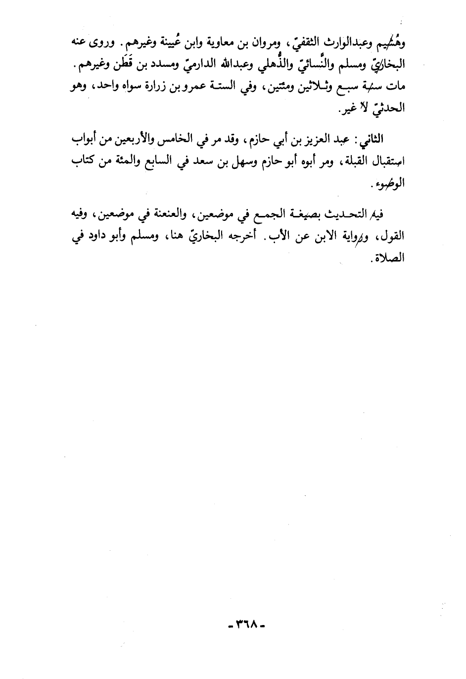 الثاني: عبد العزيز بن أبي حازم، وقد مرَّ في الخامس والأربعين من أبواب استقبال القبلة، ومرَّ أبوه أبو حازم وسهل بن سعد في السابع والمئة من كتاب الوضوء.