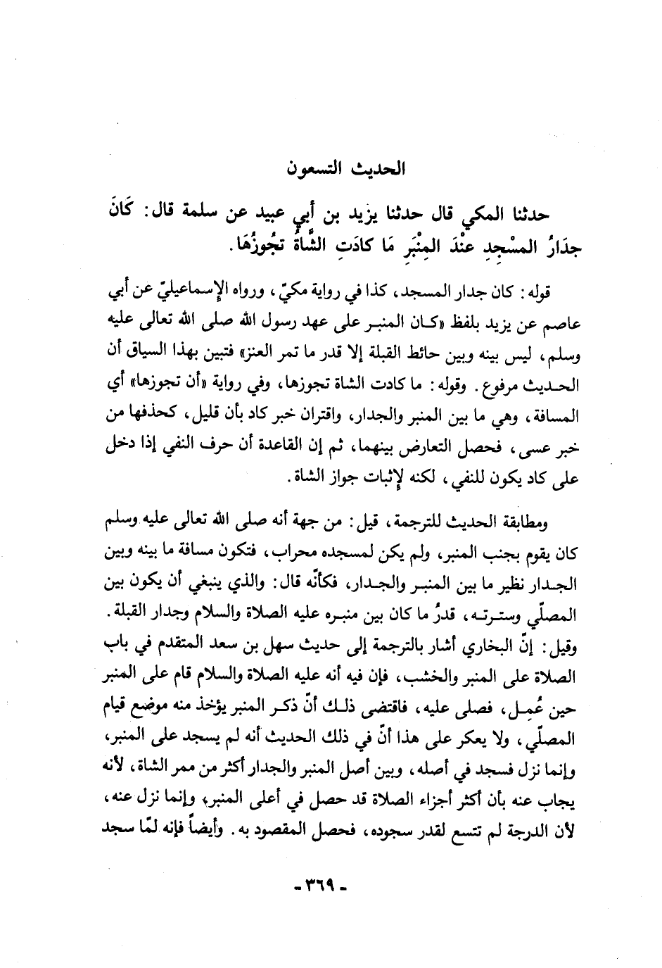 قوله: كان جدار المسجد، كذا في رواية مكيّ، ورواه الإسماعيليّ عن أبي عاصم عن يزيد بلفظ "كان المنبر على عهد رسول الله صلى الله تعالى عليه وسلم، ليس بينه وبين حائط القبلة إلا قدر ما تمر العنز" فتبين بهذا السياق أن الحديث مرفوع. وقوله: ما كادت الشاة تجوزها، وفي رواية "أن تجوزها" أي المسافة، وهي ما بين المنبر والجدار، واقتران خبر كاد بأن قليل، كحذفها من خبر عسى، فحصل التعارض بينهما، ثم إن القاعدة أن حرف النفي إذا دخل على كاد يكون للنفي، لكنه لإثبات جواز الشاة.