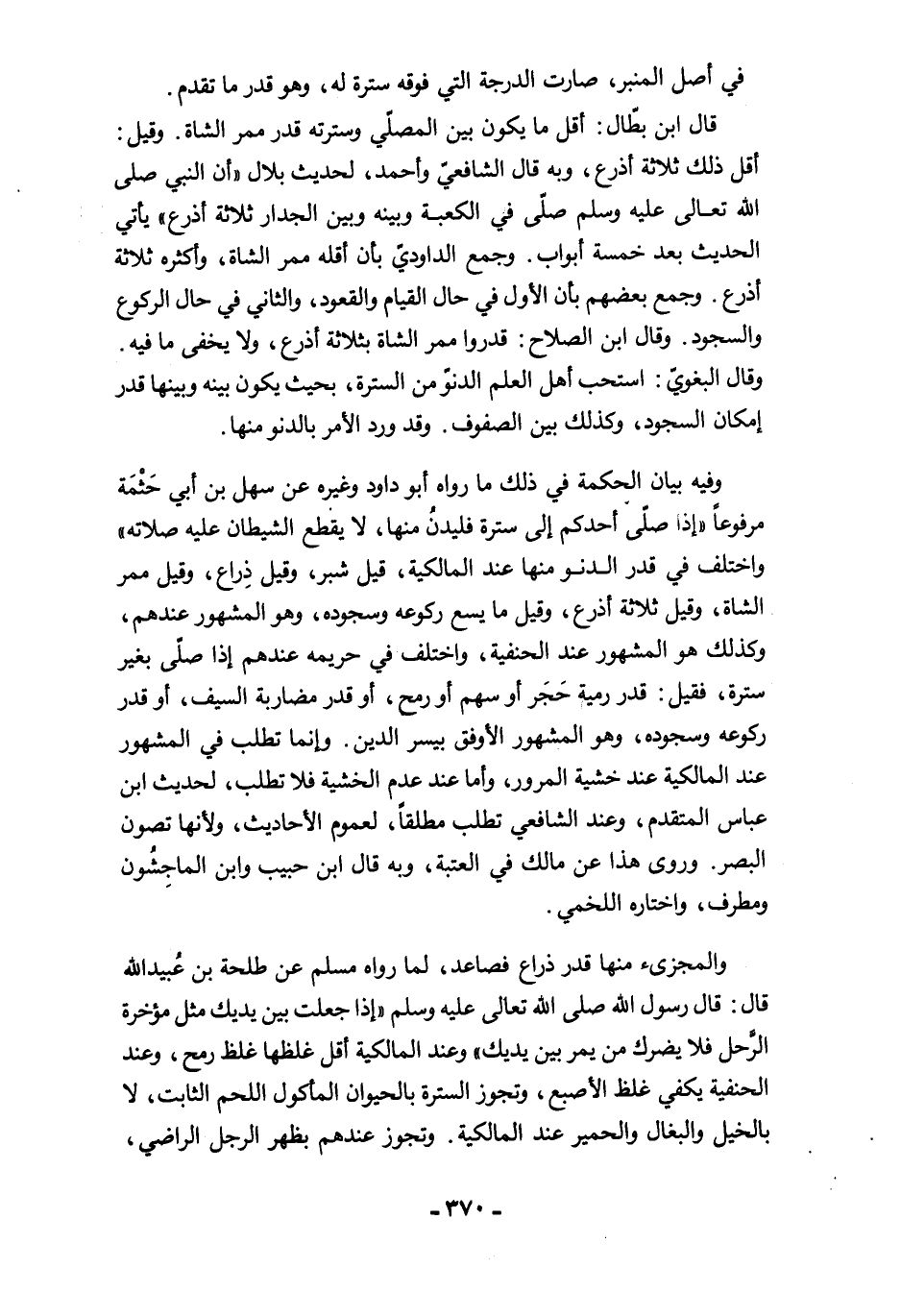 قال: قال رسول الله صلى الله تعالى عليه وسلم "إذا جعلت بين يديك مثل مؤخرة الرَّحل فلا يضرك من يمر بين يديك" وعند المالكية أقل غلظها غلظ رمح، وعند الحنفية يكفي غلظ الأصبع، وتجوز السترة بالحيوان المأكول اللحم الثابت، لا بالخيل والبغال والحمير عند المالكية. وتجوز عندهم بظهر الرجل الراضي،