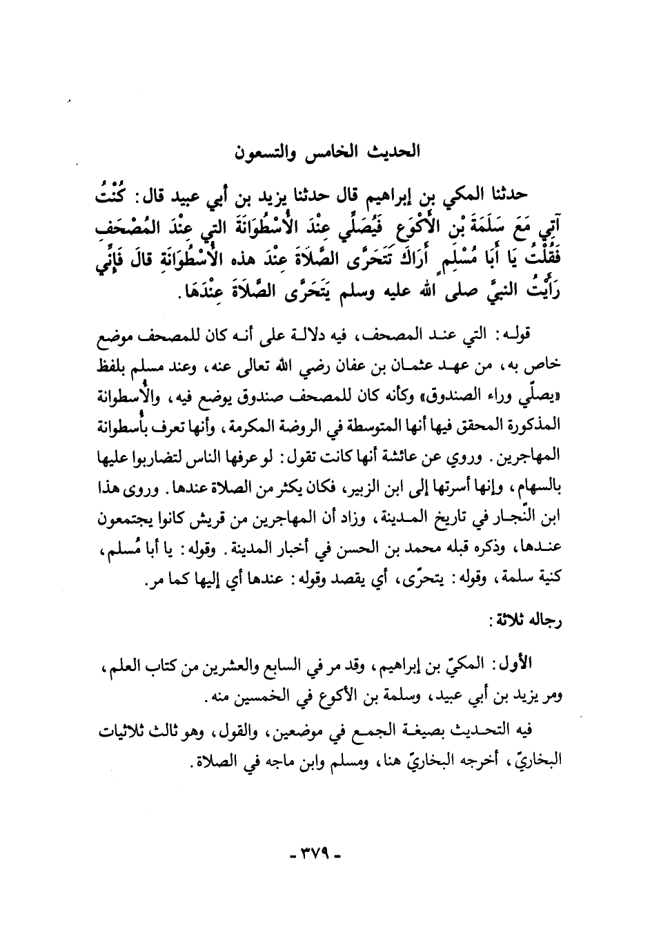 حَدَّثَنَا الْمَكِّيُّ بْنُ إِبْرَاهِيمَ قَالَ حَدَّثَنَا يَزِيدُ بْنُ أَبِي عُبَيْدٍ قَالَ: كُنْتُ آتِي مَعَ سَلَمَةَ بْنِ الأَكْوَعِ فَيُصَلِّى عِنْدَ الأُسْطُوَانَةِ الَّتِي عِنْدَ الْمُصْحَفِ. فَقُلْتُ يَا أَبَا مُسْلِمٍ أَرَاكَ تَتَحَرَّى الصَّلاَةَ عِنْدَ هَذِهِ الأُسْطُوَانَةِ. قَالَ فَإِنِّي رَأَيْتُ النَّبِيَّ -صلى الله عليه وسلم- يَتَحَرَّى الصَّلاَةَ عِنْدَهَا.