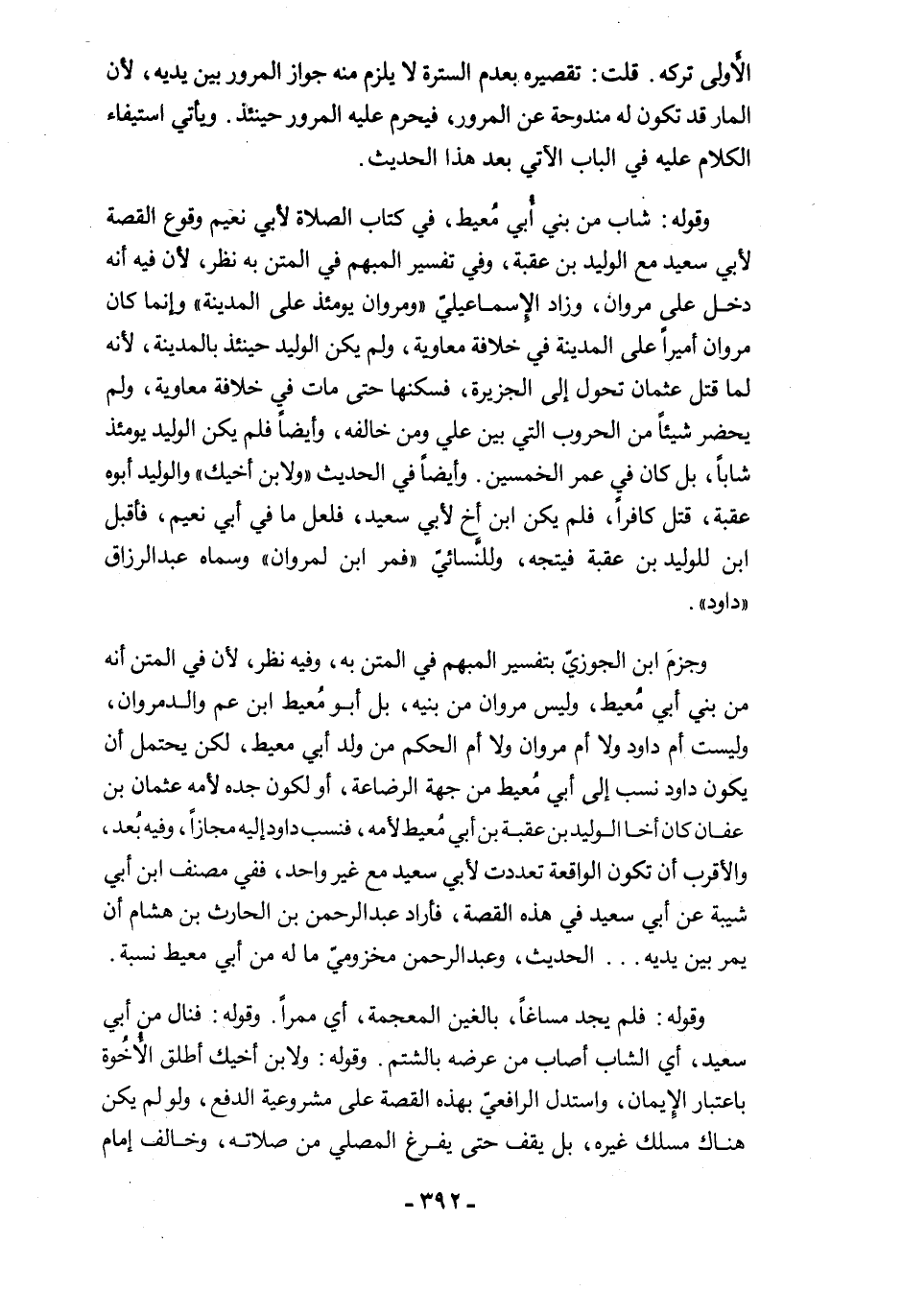 وجزمَ ابن الجوزيّ بتفسير المبهم في المتن به، وفيه نظر، لأن في المتن أنه من بني أبي مُعيط، وليس مروان من بنيه، بل أبو مُعيط ابن عم والدمروان، وليست أم داود ولا أم مروان ولا أم الحكم من ولد أبي معيط، لكن يحتمل أن يكون داود نسب إلى أبي مُعيط من جهة الرضاعة، أو لكون جده لأمه عثمان بن عفان كان أخا الوليد بن عقبة بن أبي مُعيط لأمه، فنسب داود إليه مجازًا، وفيه يُعد، والأقرب أن تكون الواقعة تعددت لأبي سعيد مع غير واحد، ففي مصنف ابن أبي شيبة عن أبي سعيد في هذه القصة، فأراد عبد الرحمن بن الحارث بن هشام أن يمر بين يديه ... الحديث، وعبد الرحمن مخزوميّ ما له من أبي معيط نسبة.