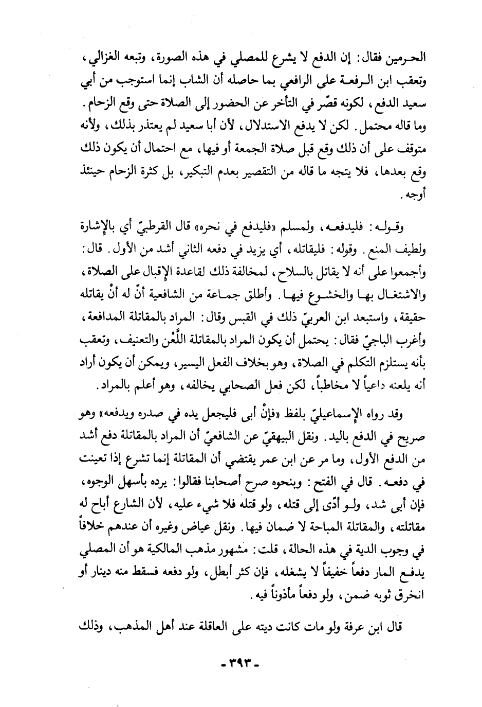 وقد رواه الإسماعيلى بلفظ "فإنْ أبى فليجعل يده في صدره ويدفعه" وهو صريح في الدفع باليد. ونقل البيهقيّ عن الشافعيّ أن المراد بالمقاتلة دفع أشد من الدفع الأول، وما مرَّ عن ابن عمر يقتضي أن المقاتلة إنما تشرع إذا تعينت في دفعه. قال في الفتح: وبنحوه صرح أصحابنا فقالوا: يرده بأسهل الوجوه، فإن أبى شد، ولو أدّى إلى قتله، ولو قتله فلا شيء عليه؛ لأن الشارع أباح له مقاتلته، والمقاتلة المباحة لا ضمان فيها. ونقل عياض وغيره أن عندهم خلافًا في وجوب الدية في هذه الحالة، قلت: مشهور مذهب المالكية هو أن المصلي يدفع المار دفعًا خفيفًا لا يشغله، فإن كثر أبطل، ولو دفعه فسقط منه دينار أو انخرق ثوبه ضمن، ولو دفعًا مأذونًا فيه.