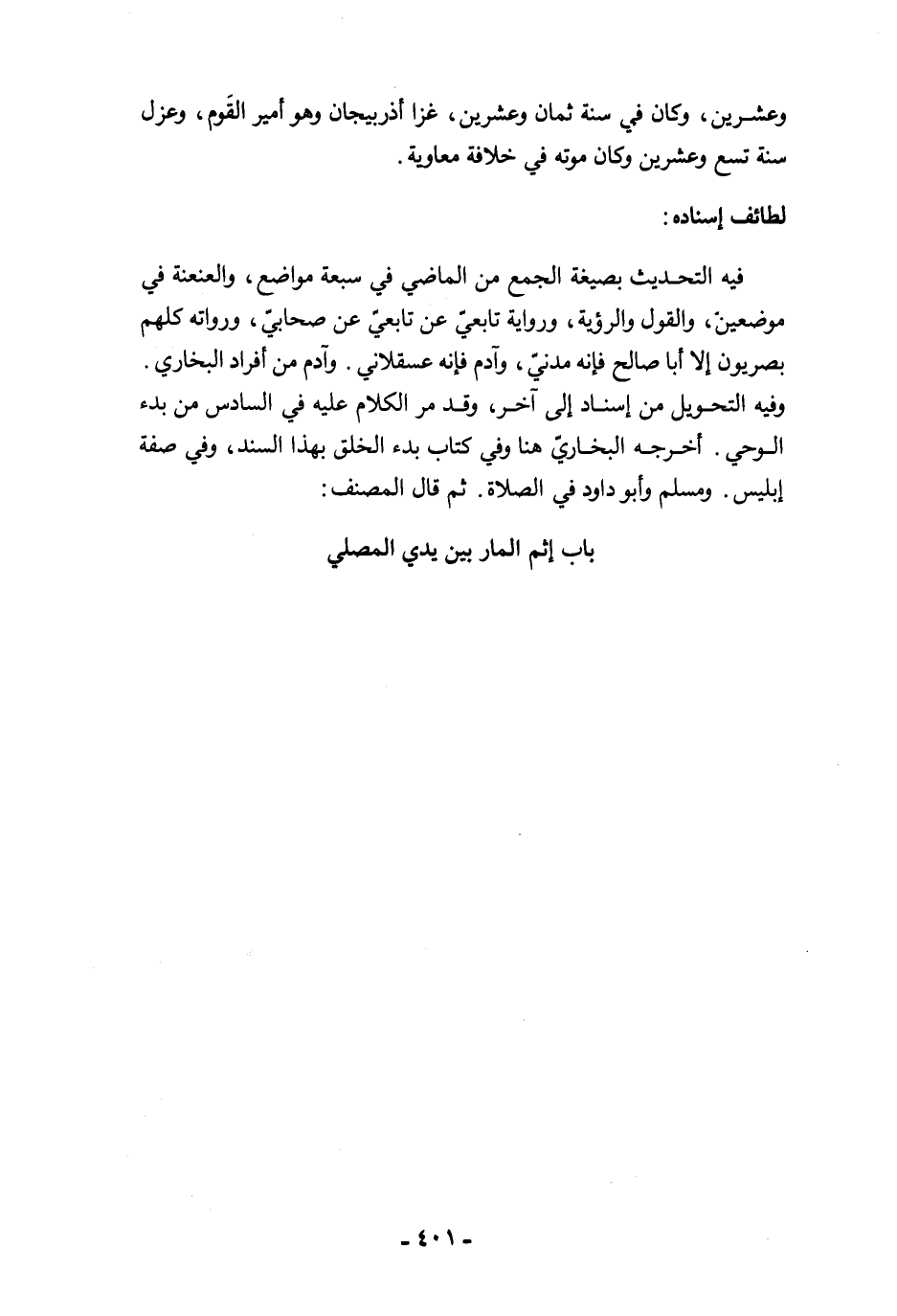فيه التحديث بصيغة الجمع من الماضي في سبعة مواضع، والعنعنة في موضعين، والقول والرؤية، ورواية تابعيّ عن تابعيّ عن صحابيّ، ورواته كلهم بصريون إلا أبا صالح فإنه مدنيّ، وآدم فإنه عسقلاني. وآدم من أفراد البخاري. وفيه التحويل من إسناد إلى آخر، وقد مرّ الكلام عليه في السادس من بدء الوحي. أخرجه البخاريّ هنا وفي كتاب بدء الخلق بهذا السند، وفي صفة إبليس. ومسلم وأبو داود في الصلاة. ثم قال المصنف: