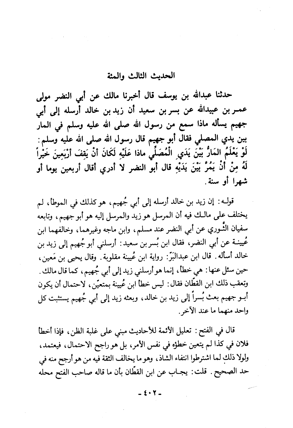 قوله: إن زيد بن خالد أرسله إلى أبي جُهيم، هو كذلك في الموطأ، لم يختلف على مالك فيه أن المرسل هو زيد والمرسل إليه هو أبو جهيم، وتابعه سفيان الثَّوري عن أبي النضر عند مسلم، وابن ماجه وغيرهما، وخالفهما ابن عُيينة عن أبي النضر، فقال ابن بُسر بن سعيد: أرسلني أبو جُهيم إلى زيد بن خالد أسأله. قال ابن عبد البَرّ: رواية ابن عُيينة مقلوبة. وقال يحيى بن مَعين، حين سئل عنها: هي خطأ، إنما هو أرسلني زيد إلى أبي جُهيم، كما قال مالك. وتعقب ذلك ابن القطّان فقال: ليس خطأ ابن عُيينة بمتعيّن، لاحتمال أن يكون أبو جهيم بعث بُسرًا إلى زيد بن خالد، وبعثه زيد إلى أبي جُهيم يستثبت كل واحد منهما ما عند الآخر.