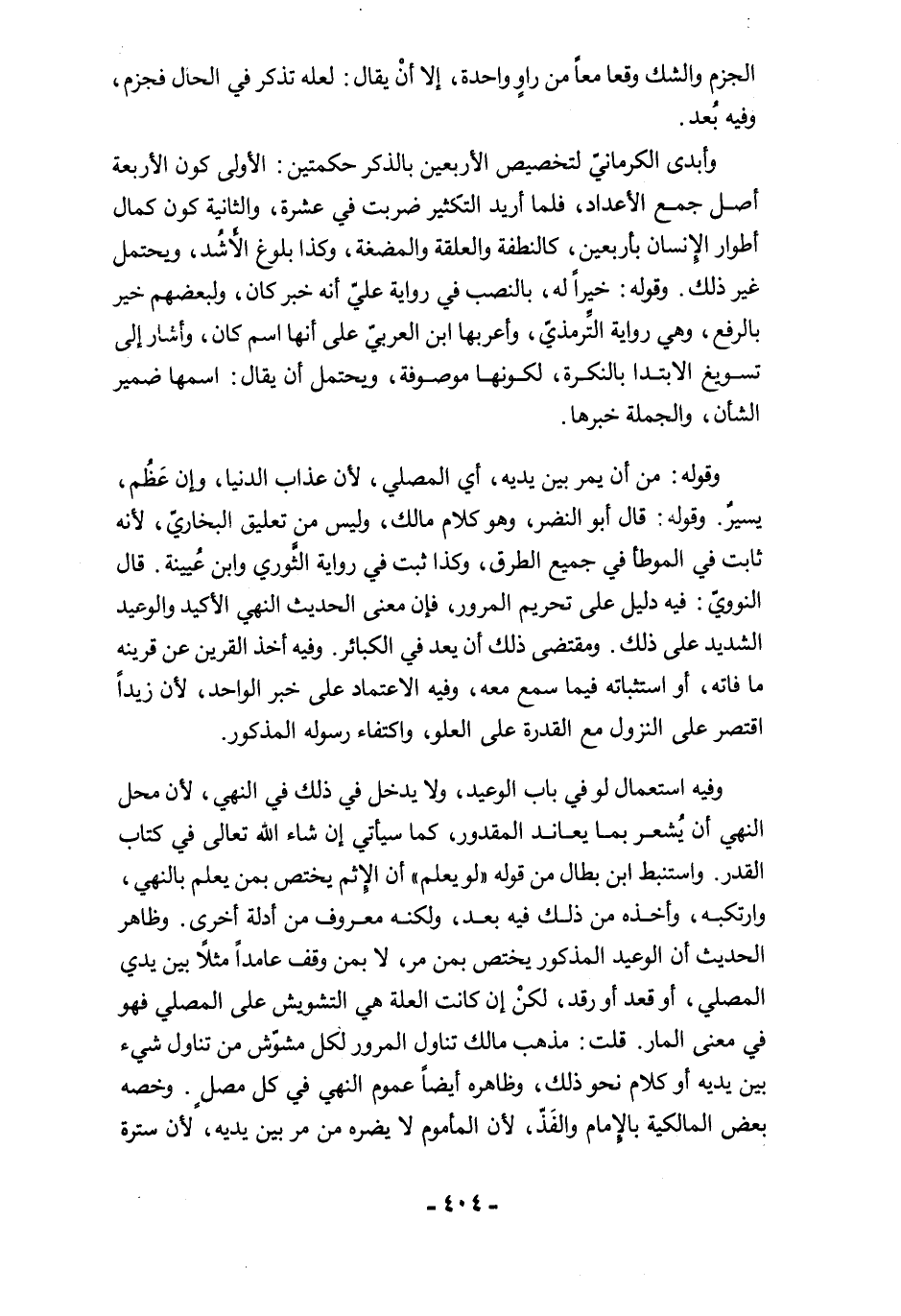 وفيه استعمال لو في باب الوعيد، ولا يدخل في ذلك في النهي، لأن محل النهي أن يُشعر بما يعاند المقدور، كما سيأتي إن شاء الله تعالى في كتاب القدر. واستنبط ابن بطال من قوله "لو يعلم" أن الإثم يختص بمن يعلم بالنهي، وارتكبه، وأخذه من ذلك فيه بعد، ولكنه معروف من أدلة أخرى. وظاهر الحديث أن الوعيد المذكور يختص بمن مرَّ، لا بمن وقف عامدًا مثلًا بين يدي المصلي، أو قعد أو رقد، لكنْ إن كانت العلة هي التشويش على المصلي فهو في معنى المار. قلت: مذهب مالك تناول المرور لكل مشوّش من تناول شيء بين يديه أو كلام نحو ذلك، وظاهره أيضًا عموم النهي في كل مصلٍ. وخصه بعض المالكية بالإمام والفَذّ، لأن المأموم لا يضره من مرَّ بين يديه، لأن سترة
