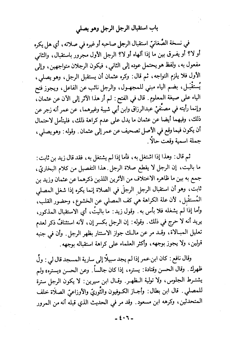 ثم قال: وهذا إذا اشتغل به، فأما إذا لم يشتغل به، فقد قال زيد بن ثابت: ما باليت، إن الرجل لا يقطع صلاة الرجل. هذا التفصيل من كلام البخاريّ، جمع به بين ما ظاهره الاختلاف من الأثرين اللذين ذكرهما عن عثمان وزيد بن ثابت، وهو أن استقبال الرجلِ الرجلَ في الصلاة إنما يكره إذا شغل المصلي المُستقْبِل، لأن علة الكراهة هي كف المصلي عن الخشوع، وحضور القلب، وأما إذا لم يشغله فلا بأس به. وقول زيد: ما باليتُ، أي الاستقبال المذكور، يريد أنه لا حرج في ذلك. وقوله: إن الرجل بكسر إن، لأنه استئنافٌ ذكر لعدم تعليل المبالاة، وقد مرَّ عن مالك جواز الاستتار بظهر الرجل. وأن في جنبه قولين، ولا يجوز بوجهه، وأكثر العلماء على كراهة استقباله بوجهه.