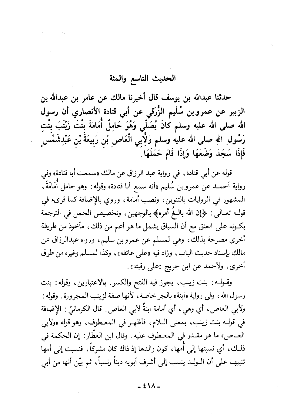 قوله عن أبي قتادة، في رواية عبد الرزاق عن مالك "سمعت أبا قتادة" وفي رواية أحمد عن عمرو بن سُليم "أنه سمع أبا قتادة" وقوله: وهو حامل أُمَامَةَ، المشهور في أدروايات بالتنوين، ونصب أمامة، وروي بالإضافة كما قرىء في قوله تعالى: {إِنَّ اللَّهَ بَالِغُ أَمْرِهِ} بالوجهين، وتخصيص العمل في الترجمة بكونه على العنق مع أن السباق يشمل ما هو أعم من ذلك، مأخوذ من طريقة أخرى مصرحة بذلك، وهي لمسلم عن عمرو بن سليم، ورواه عبد الرزاق عن مالك بإسناد حديث الباب، وزاد فيه "على عاتقه"، وكذا لمسلم وغيره من طرق أخرى، ولأحمد عن ابن جريج "على رقبته".