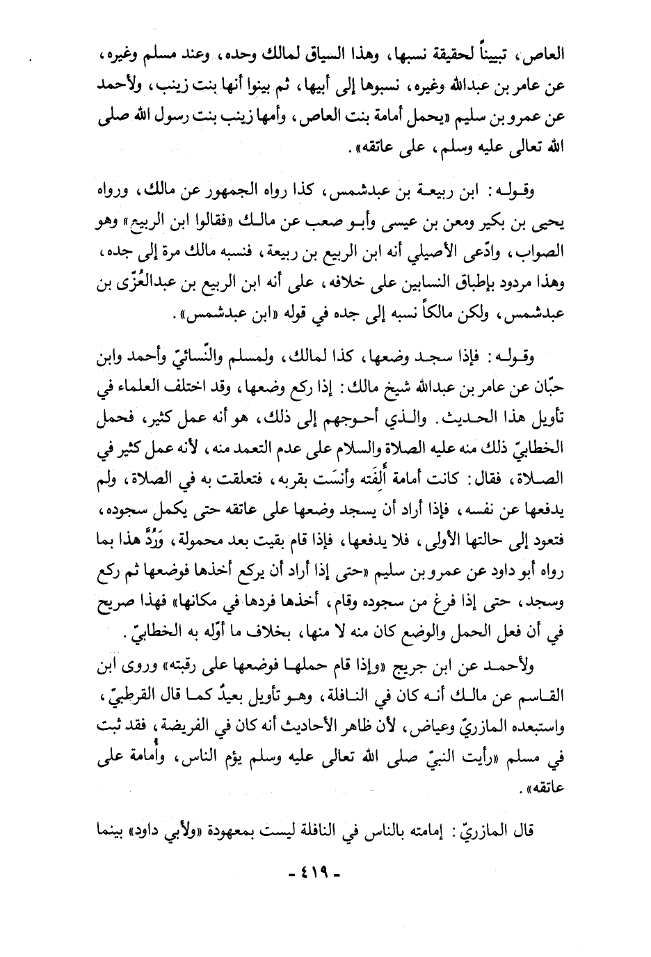 العاص، تبيينًا لحقيقة نسبها، وهذا السياق لمالك وحده، وعند مسلم وغيره، عن عامر بن عبد الله وغيره، نسبوها إلى أبيها، ثم بينوا أنها بنت زينب، ولأحمد عن عمرو بن سليم "يحمل أمامة بنت العاص، وأمها زينب بنت رسول الله صلى الله تعالى عليه وسلم، على عاتقه".