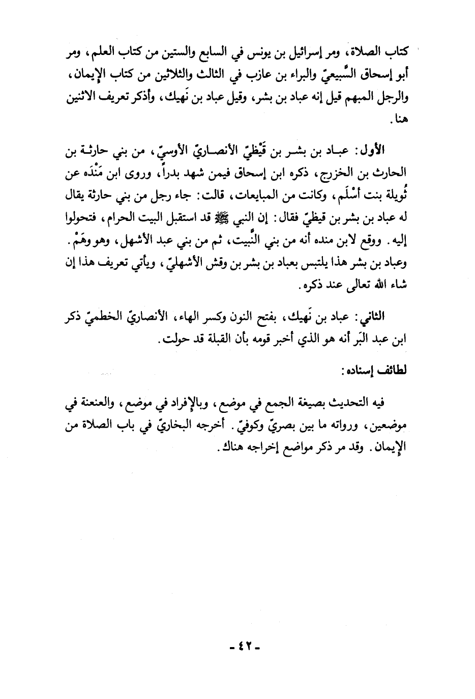 كتاب الصلاة، ومرّ إسرائيل بن يونس في السابع والستين من كتاب العلم، ومرّ أبو إسحاق السَّبيعيّ والبراء بن عازب في الثالث والثلاثين من كتاب الإيمان، والرجل المبهم قيل إنه عباد بن بشر، وقيل عباد بن نَهيك، وأذكر تعريف الاثنين هنا.