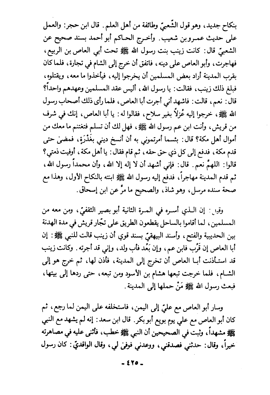 بنكاح جديد، وهو قول الشّعبيّ وطائفة من أهل العلم. قال ابن حجر: والعمل على حديث عمرو بن شعيب. وأخرج الحاكم أبو أحمد بسند صحيح عن الشعبى قال: كانت زينب بنت رسول الله -صلى الله عليه وسلم- تحت أبي العاص بن الربيع، فهاجرت، وأبو العاص على دينه، فاتفق أن خرج إلى الشام في تجارة، فلما كان بقرب المدينة أراد بعض المسلمين أن يخرجوا إليه، فيأخذوا ما معه، ويقتلوه، فبلغ ذلك زينب، فقالت: يا رسول الله، أليس عقد المسلمين وعهدهم واحدًا؟ قال: نعم، قالت: فاشهد أني أجرت أبا العاص، فلما رأى ذلك أصحاب رسول الله -صلى الله عليه وسلم-، خرجوا إليه عُزلًا بغير سلاح، فقالوا له: يا أبا العاص، إنك في شرف من قريش، وأنت ابن عم رسول الله -صلى الله عليه وسلم-، فهل لك أن تسلم فتغتنم ما معك من أموال أهل مكة؟ قال: بئسما أمرتمؤني به أن أنسخ ديني بغَدْرَةٍ، فمضى حتى قدم مكة، فدفع إلى كل ذي حق حقه، ثم قام فقال: يا أهل مكة، أوفيت ذمتي؟ قالوا: اللهمَّ نعم. قال: فإني أشهد أن لا إله إلا الله، وأن محمدًا رسول الله، ثم قدم المدينة مهاجرًا، فدفع إليه رسول الله -صلى الله عليه وسلم- ابنته بالنكاح الأول، وهذا مع صحة سنده مرسل، وهو شاذ، والصحيح ما مرَّ عن ابن إسحاق.
