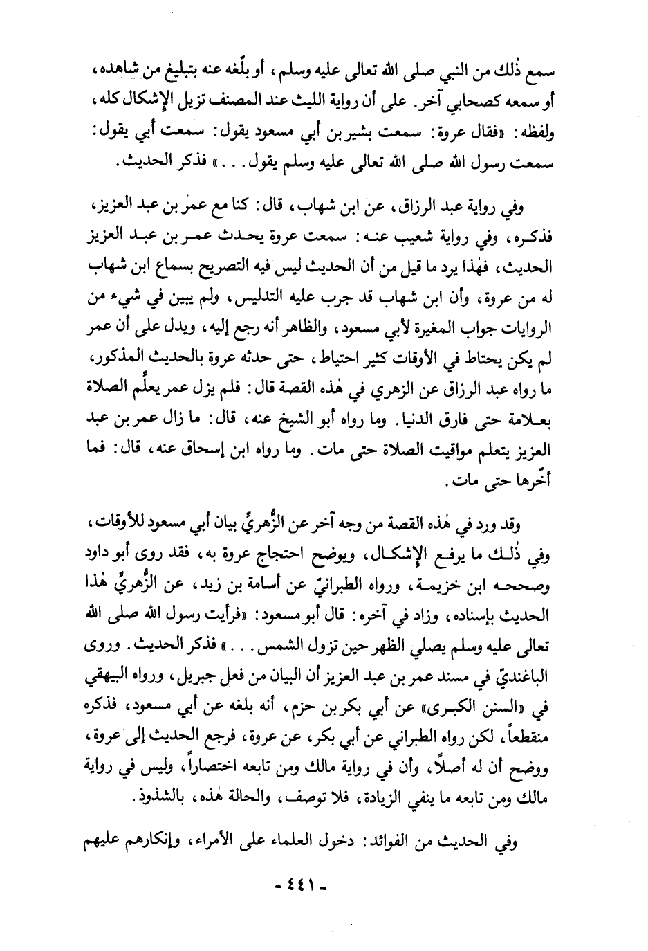 وفي رواية عبد الرزاق، عن ابن شهاب، قال: كنا مع عمر بن عبد العزيز، فذكره، وفي رواية شعيب عنه: سمعت عروة يحدث عمر بن عبد العزيز الحديث، فهذا يرد ما قيل من أن الحديث ليس فيه التصريح بسماع ابن شهاب له من عروة، وأن ابن شهاب قد جرب عليه التدليس، ولم يبين في شيء من الروايات جواب المغيرة لأبي مسعود، والظاهر أنه رجع إليه، ويدل على أن عمر لم يكن يحتاط في الأوقات كثير احتياط، حتى حدثه عروة بالحديث المذكور، ما رواه عبد الرزاق عن الزهري في هذه القصة قال: فلم يزل عمر يعلِّم الصلاة بعلامة حتى فارق الدنيا. وما رواه أبو الشيخ عنه، قال: ما زال عمر بن عبد العزيز يتعلم مواقيت الصلاة حتى مات. وما رواه ابن إسحاق عنه، قال: فما أخّرها حتى مات.