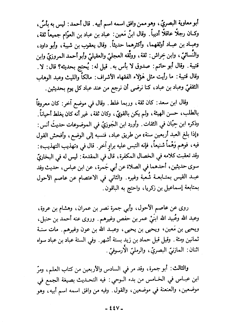 وقال ابن سعد: كان ثقة، وربما غلط. وقال في موضع آخر: كان معروفًا بالطلب، حسن الهيئة، ولم يكن بالقويّ، وكان ثقة، غير أنه كان يغلط أحيانًا. وذكره ابن حِبّان في الثقات. وأورد ابن الجَوزيّ في الموضوعات حديثَ أنس: "إذا بلغ العبد أربعين سنة" من طريق عباد، فنسبه إلى الوضع، وأفحش القول فيه، فوهم وَهْمًا شنيعًا، فإنه التبس عليه براوٍ آخر. قال في "تهذيب التهذيب": وقد تعقبت كلامه في الخصال المكفرة، قال في المقدمة: ليس له في البخاريّ سوى حديثين، أحدهما في الصلاة عن أبي جَمرة، عن ابن عباس، حديث وقد عبد القيس بمتابعة شُعبة وغيره. والثاني في الاعتصام عن عاصم الأحول بمتابعة إسماعيل بن زكريا، واحتج به الباقون.