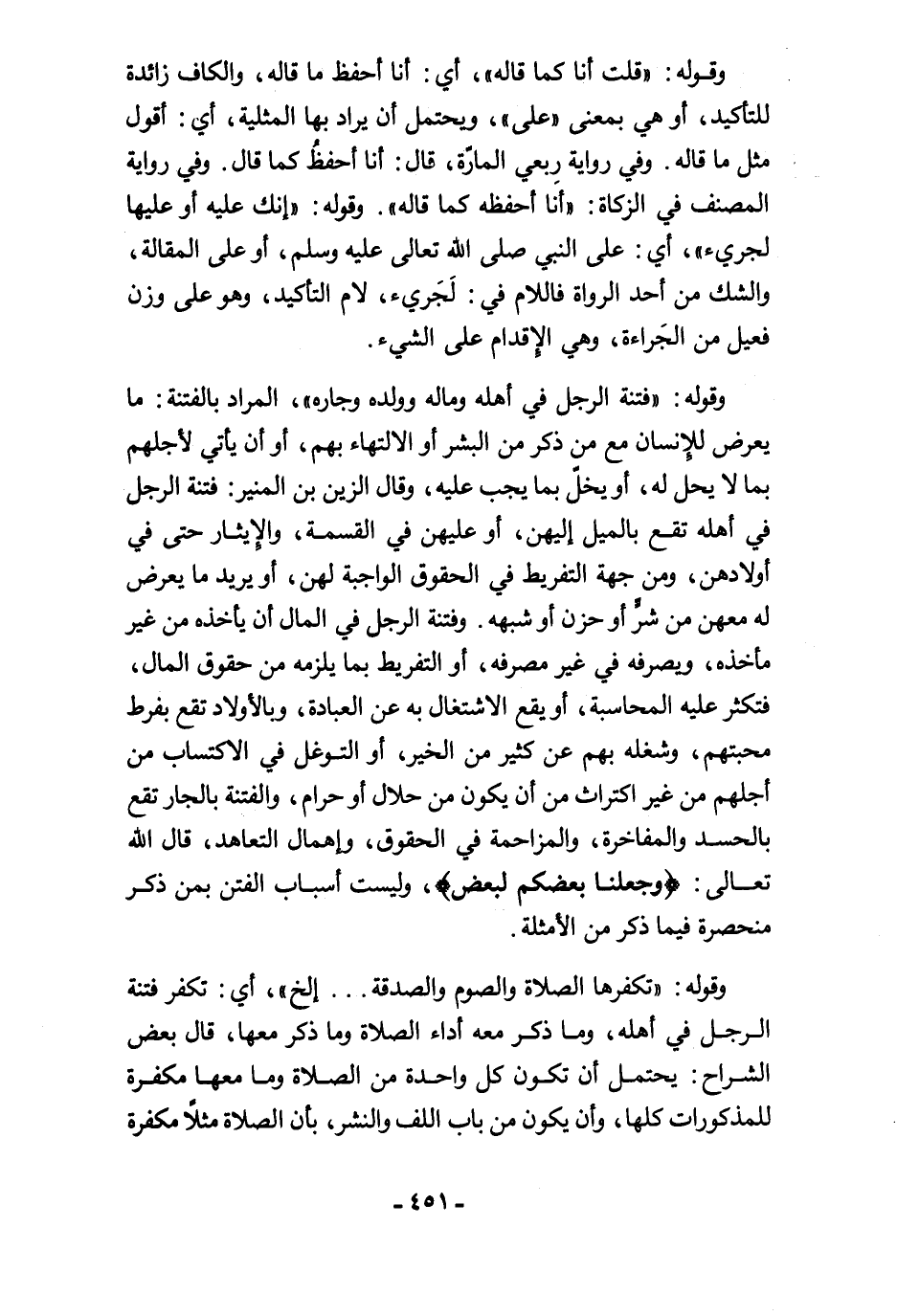 وقوله: "فتنة الرجل في أهله وماله وولده وجاره"، المراد بالفتنة: ما يعرض للإنسان مع من ذكر من البشر أو الالتهاء بهم، أو أن يأتي لأجلهم بما لا يحل له، أو يخلّ بما يجب عليه، وقال الزين بن المنير: فتنة الرجل في أهله تقع بالميل اليهن، أو عليهن في القسمة، والإيثار حتى في أولادهن، ومن جهة التفريط في الحقوق الواجبة لهن، أو يريد ما يعرض له معهن من شرٍّ أو حزن أو شبهه. وفتنة الرجل في المال أن يأخذه من غير مأخذه، ويصرفه في غير مصرفه، أو التفريط بما يلزمه من حقوق المال، فتكثر عليه المحاسبة، أو يقع الاشتغال به عن العبادة، وبالأولاد تقع بفرط محبتهم، وشغله بهم عن كثير من الخير، أو التوغل في الاكتساب من أجلهم من غير اكتراث من أن يكون من حلال أو حرام، والفتنة بالجار تقع بالحسد والمفاخرة، والمزاحمة في الحقوق، وإهمال التعاهد، قال الله تعالى: {وَجَعَلْنَا بَعْضَكُمْ لِبَعْضٍ}، وليست أسباب الفتن بمن ذكر منحصرة فيما ذكر من الأمثلة.