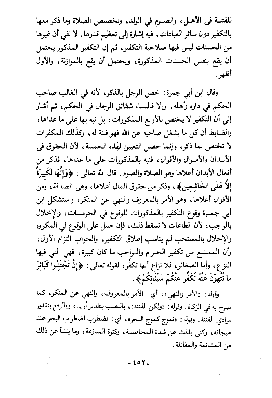 وقال ابن أبي جمرة: خص الرجل بالذكر، لأنه في الغالب صاحب الحكم في داره وأهله، وإلا فالنساء شقائق الرجال في الحكم، ثم أشار إلى أن التكفير لا يختص بالأربع المذكورات، بل نبه بها على ما عداها، والضابط أن كل ما يشغل صاحبه عن الله فهو فتنة له، وكذلك المكفرات لا تختص بما ذكر، وإنما حصل التعيين لهذه الخمس، لأن الحقوق في الأبدان والأموال والأقوال، فنبه بالمذكورات على ما عداها، فذكر من أفعال الأبدان أعلاها وهو الصلاة والصوم. قال الله تعالى: {وَإِنَّهَا لَكَبِيرَةٌ إِلَّا عَلَى الْخَاشِعِينَ}، وذكر من حقوق المال أعلاها، وهي الصدقة، ومن الأقوال أعلاها، وهو الأمر بالمعروف والنهي عن المنكر، واستشكل ابن أبي جمرة وقوع التكفير بالمذكورات للوقوع في الحرمات، والإخلال بالواجب؛ لأن الطاعات لا تسقط ذلك، فإن حمل على الوقوع في المكروه والإخلال بالمستحب لم يناسب إطلاق التكفير، والجواب التزام الأول، وأن الممتنع من تكفير الحرام والواجب ما كان كبيرة، فهي التي فيها النزاع، وأما الصغائر، فلا نزاع أنها تكفِّر، لقوله تعالى: {إِنْ تَجْتَنِبُوا كَبَائِرَ مَا تُنْهَوْنَ عَنْهُ نُكَفِّرْ عَنْكُمْ سَيِّئَاتِكُمْ}.