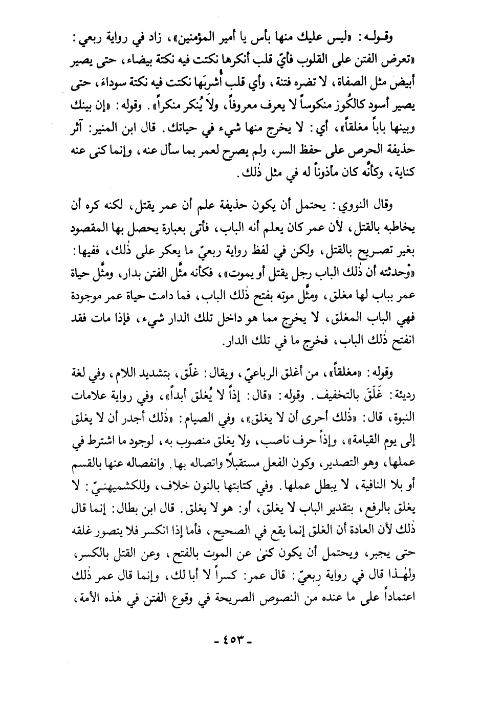 وقال النووي: يحتمل أن يكون حذيفة علم أن عمر يقتل، لكنه كره أن يخاطبه بالقتل؛ لأن عمر كان يعلم أنه الباب، فأتى بعبارة يحصل بها المقصود بغير تصريح بالقتل، ولكن في لفظ رواية ربعيّ ما يعكر على ذلك، ففيها: "وحدثته أن ذلك الباب رجل يقتل أو يموت"، فكأنه مثَّل الفتن بدار، ومثَّل حياة عمر بباب لها مغلق، ومثَّل موته بفتح ذلك الباب، فما دامت حياة عمر موجودة فهي الباب المغلق، لا يخرج مما هو داخل تلك الدار شيء، فإذا مات فقد انفتح ذلك الباب، فخرج ما في تلك الدار.