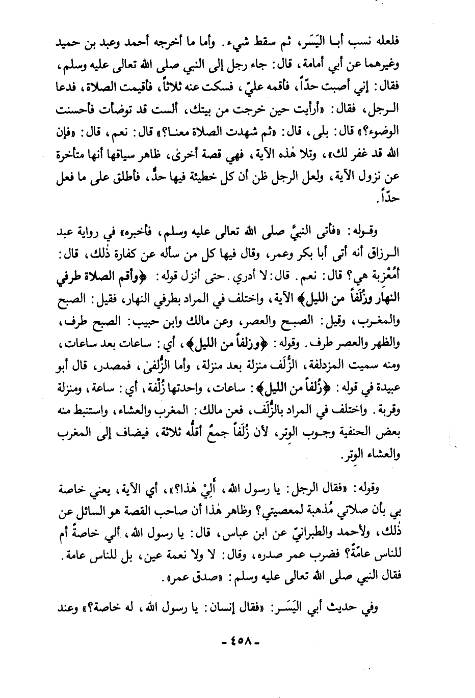 فلعله نسب أبا اليَسَر، ثم سقط شيء. وأما ما أخرجه أحمد وعبد بن حميد وغيرهما عن أبي أمامة، قال: جاء رجل إلى النبي صلى الله تعالى عليه وسلم، فقال: إني أصبت حدًّا، فأقمه عليّ، فسكت عنه ثلاثًا، فأقيمت الصلاة، فدعا الرجل، فقال: "أرأيت حين خرجت من بيتك، ألست قد توضأت فأحسنت الوضوء؟ " قال: بلى، قال: "ثم شهدت الصلاة معنا؟ " قال: نعم، قال: "فإن الله قد غفر لك"، وتلا هذه الآية، فهي قصة أخرى، ظاهر سياقها أنها متأخرة عن نزول الآية، ولعل الرجل ظن أن كل خطيئة فيها حدٌّ، فأطلق على ما فعل حدًّا.