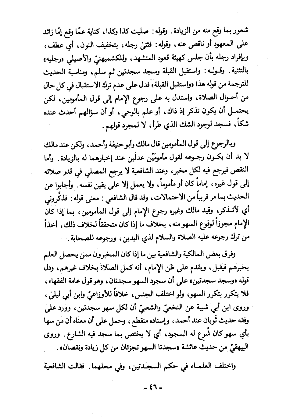 وبالرجوع إلى قول المأمومين قال مالك وأبو حنيفة وأحمد، ولكن عند مالك لابد أن يكون رجوعه لقول مأمومَيْن عدلَين عند إخبارهما له بالزيادة. وأما النقص فيرجع فيه لكل مخبر، وعند الشافعية لا يرجع المصلي في قدر صلاته إلى قول غيره، إمامًا كان أو مأمومًا، ولا يعمل إلا على يقين نفسه. وأجابوا عن الحديث بما مرّ قريبًا من الاحتمالات، وقد قال الشافعي: معنى قوله: فذكِّروني أي لأتذكر، وقيد مالك وغيره رجوع الإِمام إلى قول المأمومين، بما إذا كان الإِمام مجوزًا لوقوع السهو منه، بخلاف ما إذا كان متحققًا لخلاف ذلك، أخذًا من ترك رجوعه عليه الصلاة والسلام لذي اليدين، ورجوعه للصحابة.