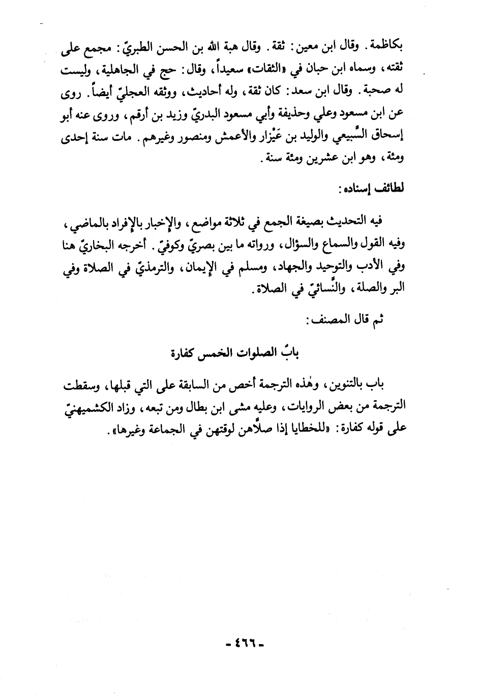باب بالتنوين، وهذه الترجمة أخص من السابقة على التي قبلها، وسقطت الترجمة من بعض الروايات، وعليه مشى ابن بطال ومن نبعه، وزاد الكشميهنيّ على قوله كفارة: "للخطايا إذا صلاَّهن لوقتهن في الجماعة وغيرها".