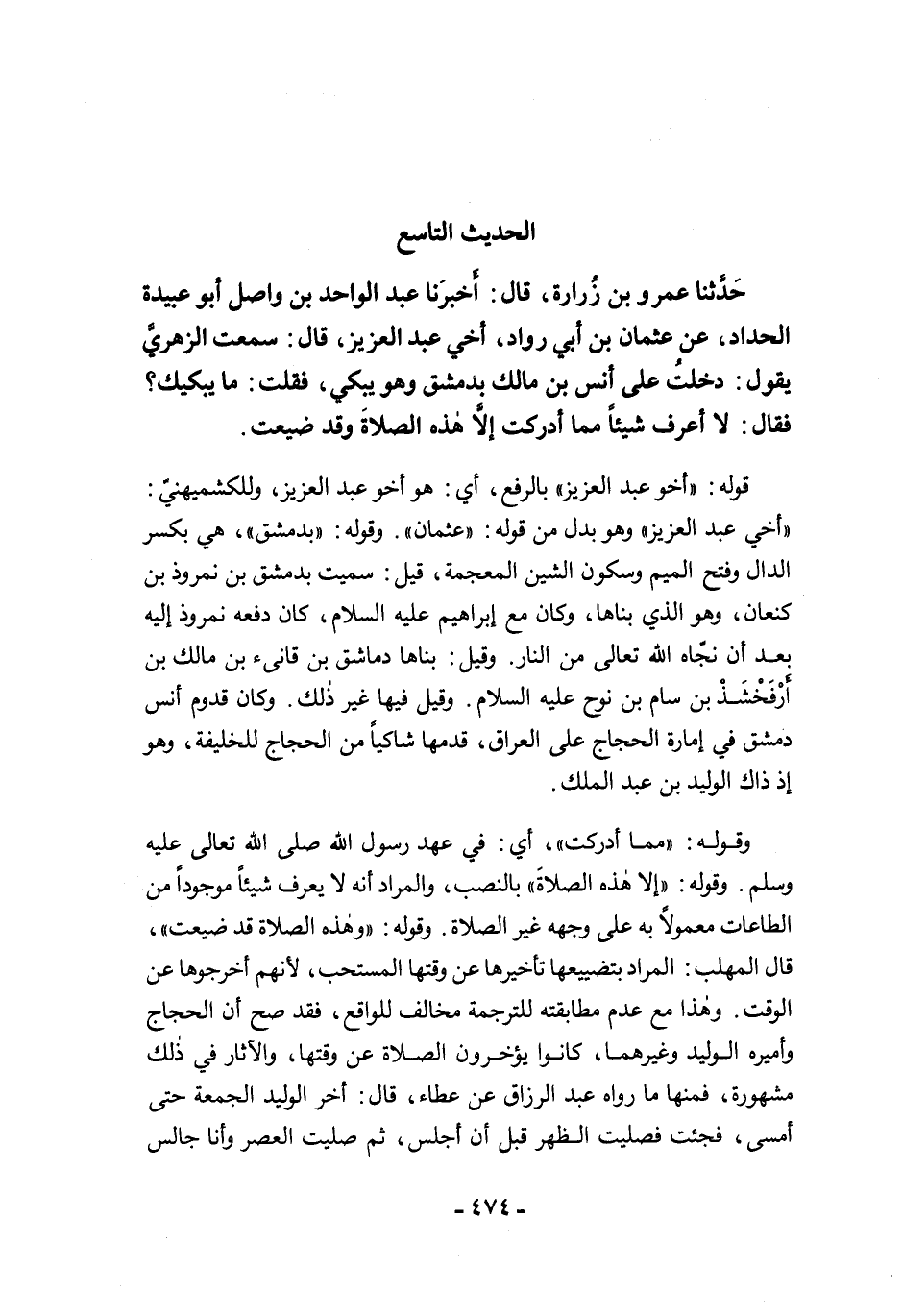 حَدَّثَنَا عَمْرُو بْنُ زُرَارَةَ، قَالَ: أَخْبَرَنَا عَبْدُ الْوَاحِدِ بْنُ وَاصِلٍ أَبُو عُبَيْدَةَ الْحَدَّادُ، عَنْ عُثْمَانَ بْنِ أَبِي رَوَّادٍ، أَخِي عَبْدِ الْعَزِيزِ، قَالَ: سَمِعْتُ الزُّهْرِيَّ يَقُولُ: دَخَلْتُ عَلَى أَنَسِ بْنِ مَالِكٍ بِدِمَشْقَ وَهُوَ يَبْكِي، فَقُلْتُ: مَا يُبْكِيكَ؟ فَقَالَ: لاَ أَعْرِفُ شَيْئًا مِمَّا أَدْرَكْتُ إِلاَّ هَذِهِ الصَّلاَةَ وَقَدْ ضُيِّعَتْ.