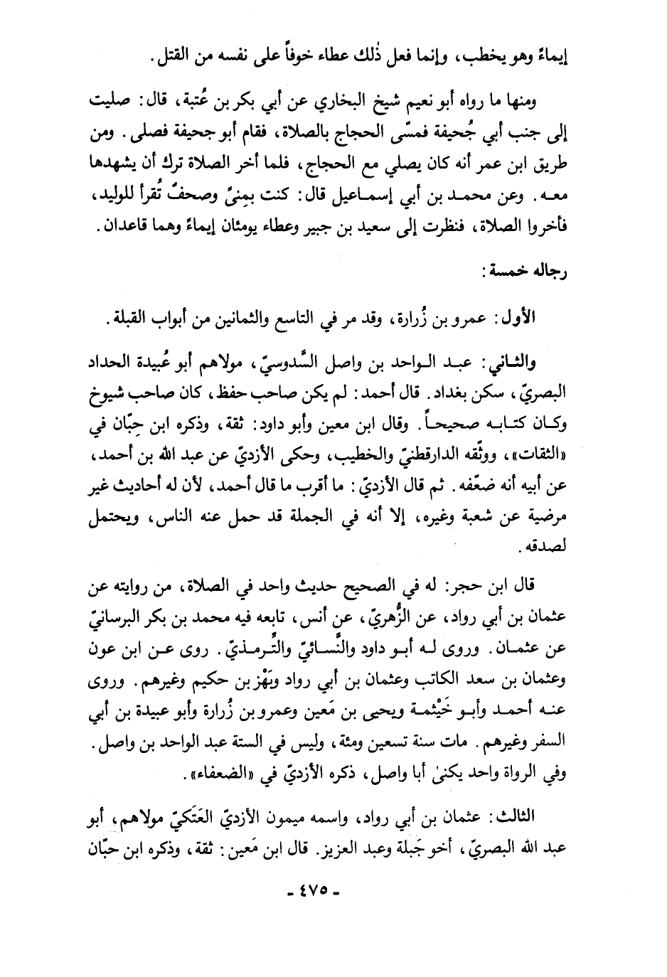 قال ابن حجر: له في الصحيح حديث واحد في الصلاة، من روايته عن عثمان بن أبي رواد، عن الزُّهريّ، عن أنس، تابعه فيه محمد بن بكر البرسانيّ عن عثمان. وروى له أبو داود والنَّسائيّ والتِّرمذيّ. روى عن ابن عون وعثمان بن سعد الكاتب وعثمان بن أبي رواد وبَهْز بن حكيم وغيرهم. وروى عنه أحمد وأبو خَيْثمة ويحيى بن مَعين وعمرو بن زُرارة وأبو عبيدة بن أبي السفر وغيرهم. مات سنة تسعين ومئة، وليس في الستة عبد الواحد بن واصل. وفي الرواة واحد يكنى أبا واصل، ذكره الأزديّ في "الضعفاء".