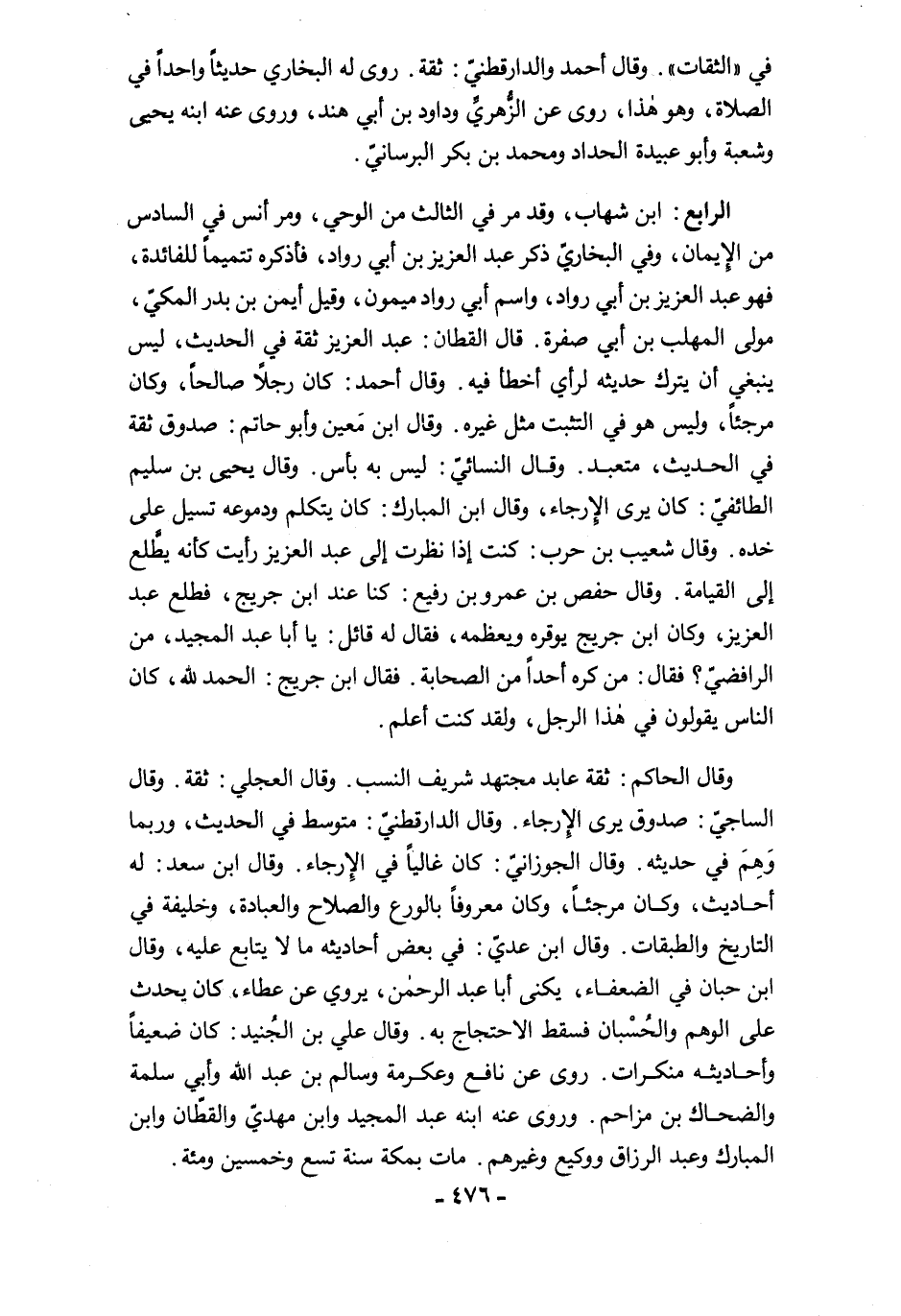 الرابع: ابن شهاب، وقد مرَّ في الثالث من الوحي، ومرَّ أنس في السادس من الإيمان، وفي البخاريّ ذكر عبد العزيز بن أبي رواد، فأذكره تتميمًا للفائدة، فهو عبد العزيز بن أبي رواد، واسم أبي رواد ميمون، وقيل أيمن بن بدر المكيّ، مولى المهلب بن أبي صفرة. قال القطان: عبد العزيز ثقة في الحديث، ليس ينبغي أن يترك حديثه لرأي أخطأ فيه. وقال أحمد: كان رجلًا صالحًا، وكان مرجئًا، وليس هو في التثبت مثل غيره. وقال ابن مَعين وأبو حاتم: صدوق ثقة في الحديث، متعبد. وقال النسائيّ: ليس به بأس. وقال يحيى بن سليم الطائفى: كان يرى الإِرجاء، وقال ابن المبارك: كان يتكلم ودموعه تسيل على خده. وقال شعيب بن حرب: كنت إذا نظرت إلى عبد العزيز رأيت كأنه يطَّلع إلى القيامة. وقال حفص بن عمرو بن رفيع: كنا عند ابن جريج، فطلع عبد العزيز، وكان ابن جريج يوقره ويعظمه، فقال له قائل: يا أبا عبد المجيد، من الرافضيّ؟ فقال: من كره أحدًا من الصحابة. فقال ابن جريج: الحمد لله، كان الناس يقولون في هذا الرجل، ولقد كنت أعلم.