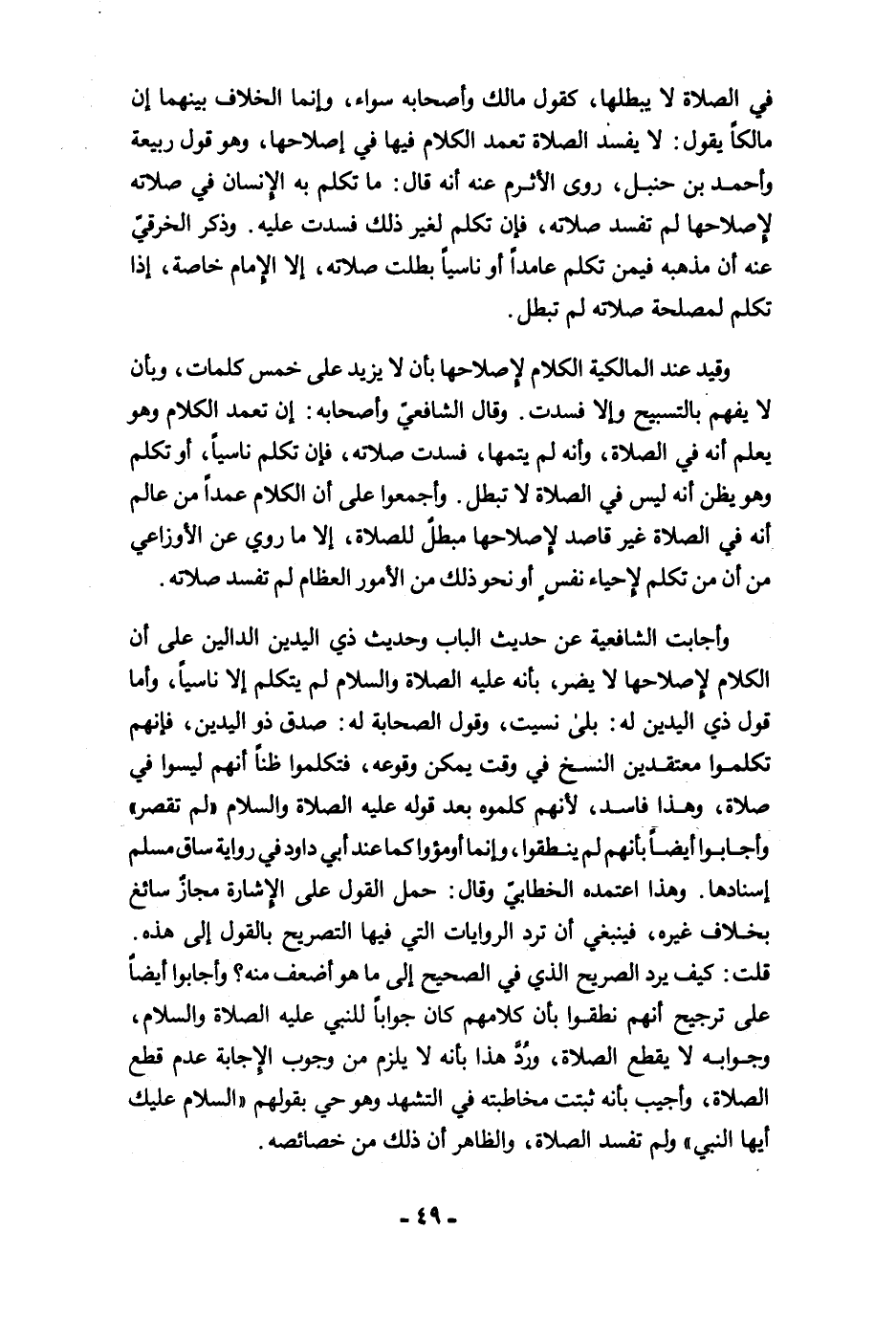 وأجابت الشافعية عن حديث الباب وحديث ذي اليدين الدالين على أن الكلام لإصلاحها لا يضر، بأنه عليه الصلاة والسلام لم يتكلم إلا ناسيًا، وأما قول ذي اليدين له: بلى نسيت، وقول الصحابة له؟ صدق ذو اليدين، فإنهم تكلموا معتقدين النسخ في وقت يمكن وقوعه، فتكلموا ظنًا أنهم ليسوا في صلاة، وهذا فاسد؛ لأنهم كلموه بعد قوله عليه الصلاة والسلام "لم تقصر" وأجابوا أيضًا بأنهم لم ينطقوا، وإنما أومؤوا كما عند أبي داود في رواية ساق مسلم إسنادها. وهذا اعتمده الخطابى وقال: حمل القول على الإشارة مجاز سائغ بخلاف غيره، فينبغي أن ترد الروايات التي فيها التصريح بالقول إلى هذه. قلت: كيف يرد الصريح الذي في الصحيح إلى ما هو أضعف منه؟ وأجابوا أيضًا على ترجيح أنهم نطقوا بأن كلامهم كان جوابًا للنبي عليه الصلاة والسلام، وجوابه لا يقطع الصلاة، ورُدَّ هذا بأنه لا يلزم من وجوب الإجابة عدم قطع الصلاة، وأجيب بأنه ثبتت مخاطبته في التشهد وهو حي بقولهم "السلام عليك أيها النبي" ولم تفسد الصلاة، والظاهر أن ذلك من خصائصه.