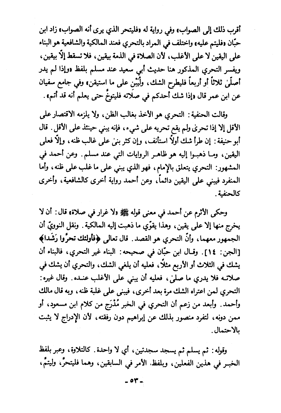أقرب ذلك إلى الصواب" وفي رواية له "فليتحر الذي يرى أنه الصواب" زاد ابن حبَّان "فليتم عليه" واختلف في المراد بالتحري فعند المالكية والشافعية هو البناء على اليقين لا على الأغلب, لأن الصلاة في الذمة بيقين، فلا تسقط إلاّ بيقين، ويفسر التحري المذكور هنا حديث أبي سعيد عند مسلم بلفظ "وإذا لم يدر أصلّى ثلاثًا أو أربعًا فليطرح الشك، ولْيَبْنِ على ما استيقن" وفي جامع سفيان عن ابن عمر قال "إذا شك أحدكم في صلاته فليتوخَّ حتى يعلم أنه قد أتم".