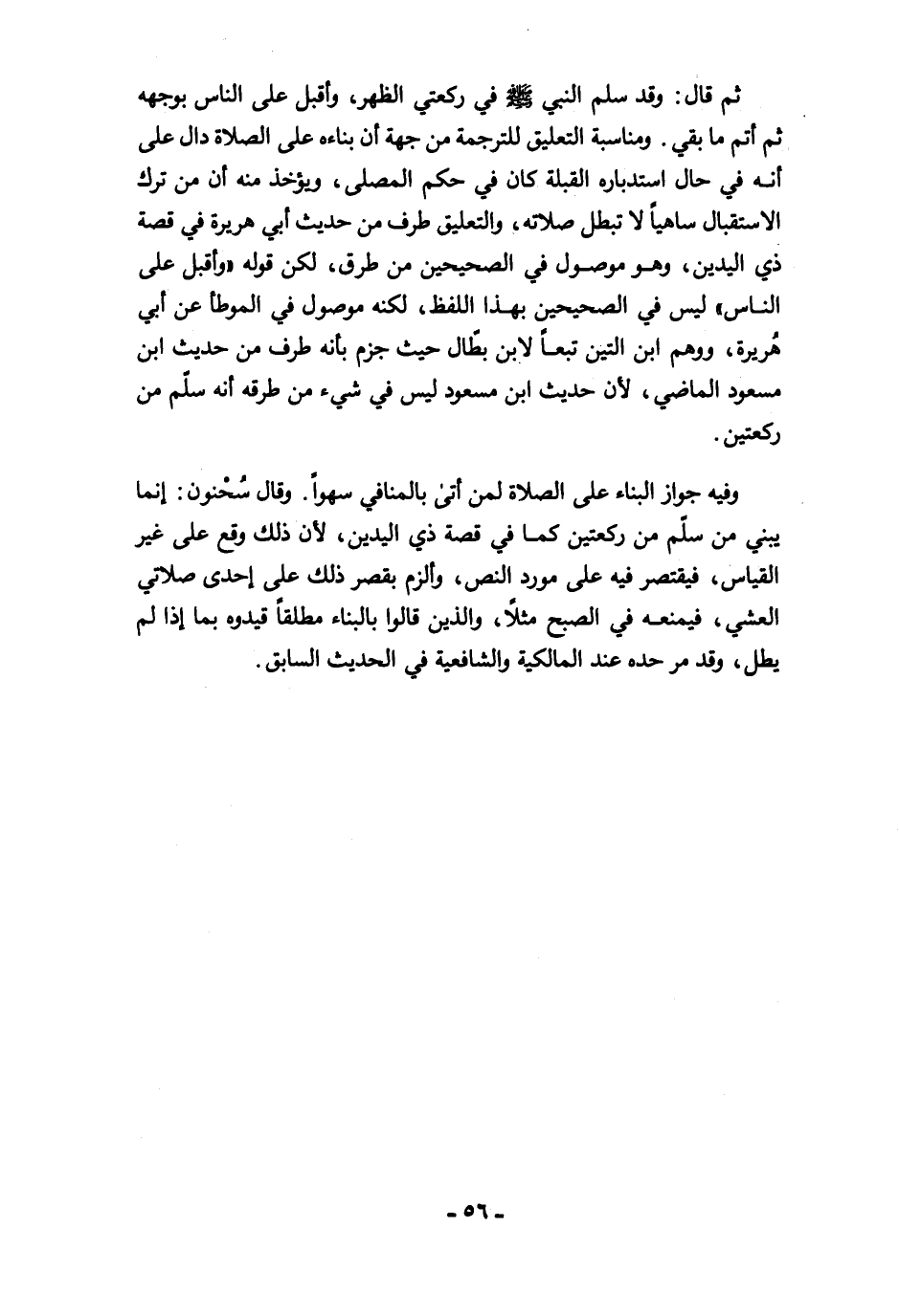 وفيه جواز البناء على الصلاة لمن أتى بالمنافي سهوًا. وقال سُحْنون: إنما يبني من سلّم من ركعتين كما في قصة ذي اليدين, لأن ذلك وقع على غير القياس، فيقتصر فيه على مورد النص، وألزم بقصر ذلك على إحدى صلاتي العشي، فيمنعه في الصبح مثلًا، والذين قالوا بالبناء مطلقًا قيدوه بما إذا لم يطل، وقد مر حده عند المالكية والشافعية في الحديث السابق.