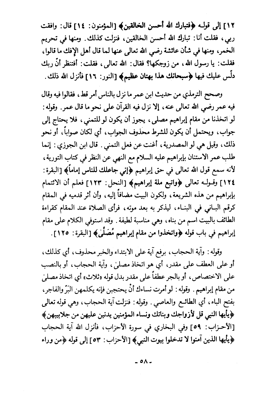 وقوله: وآية الحجاب، برفع آية على الابتداء والخبر محذوف، أي كذلك، أو على العطف على مقدر، أي هو اتخاذ مصلى، وآية الحجاب، أو بالنصب على الاختصاص، أو بالجر عطفًا على مقدر بدل قوله "ثلاث" أي اتخاذ مصلى من مقام إبراهيم. وقوله: لو أمرت نساءك أنْ يحتجبن فإنه يكلمهن البَرّ والفاجر، بفتح الباء، أي الطائع والعاصي. وقوله: فنزلت آية الحجاب، وهي قوله تعالى {يَا أَيُّهَا النَّبِيُّ قُلْ لِأَزْوَاجِكَ وَبَنَاتِكَ وَنِسَاءِ الْمُؤْمِنِينَ يُدْنِينَ عَلَيْهِنَّ مِنْ جَلَابِيبِهِنَّ} [الأحزاب: 59] وفي البخاري في سورة الأحزاب، فأنزل الله آية الحجاب {يَا أَيُّهَا الَّذِينَ آمَنُوا لَا تَدْخُلُوا بُيُوتَ النَّبِيِّ} [الأحزاب: 53] إلى قوله {مِنْ وَرَاءِ